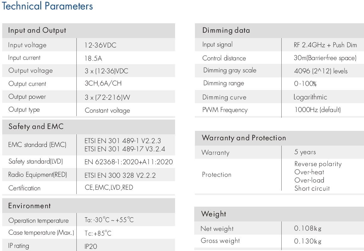 - Количество выходных каналов: 3 канала x 6 А макс.