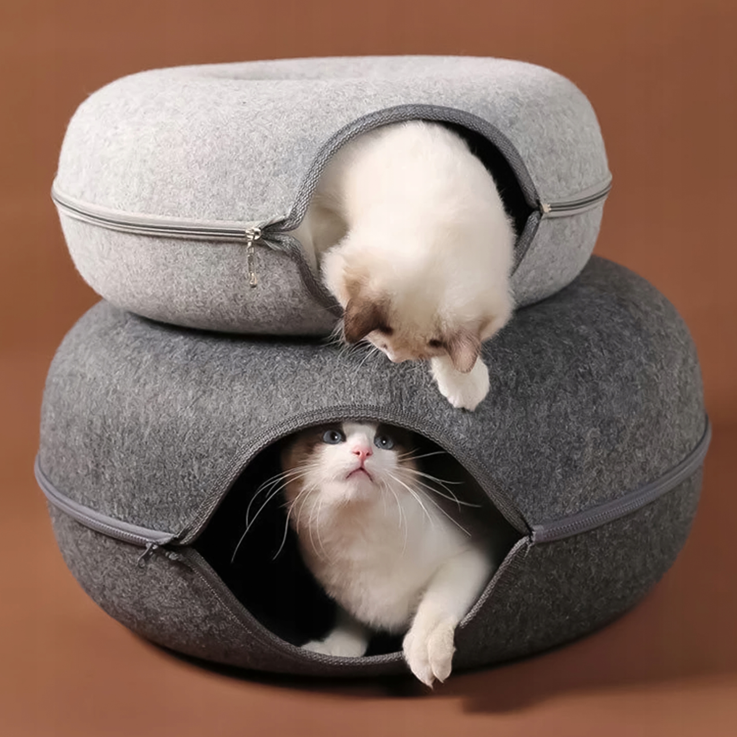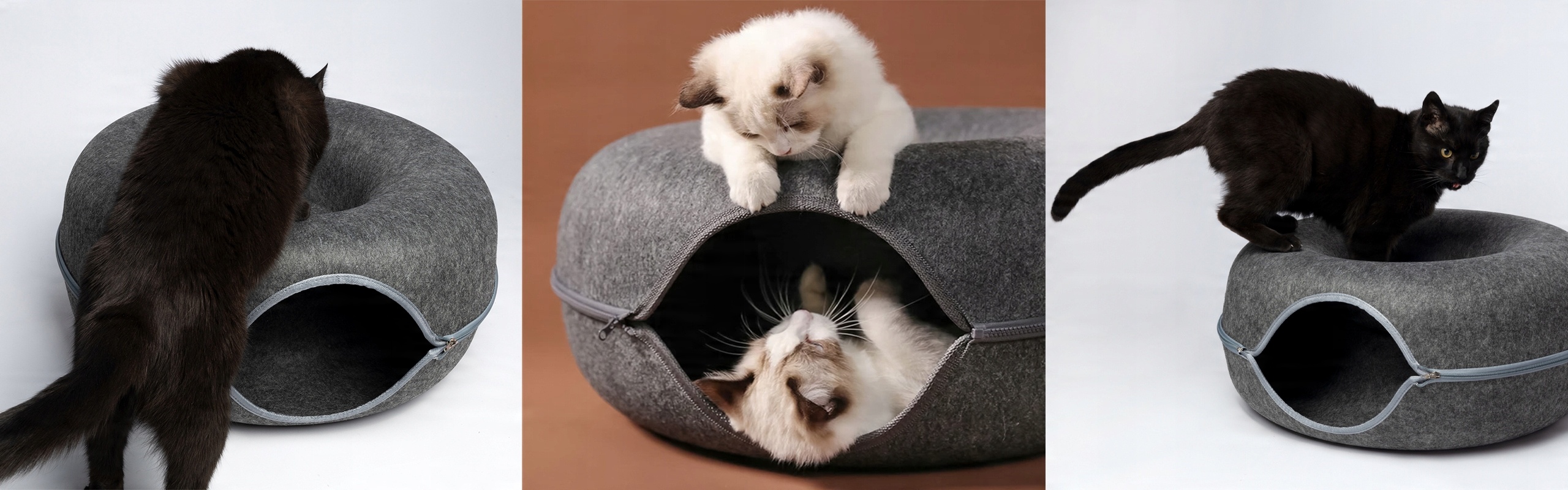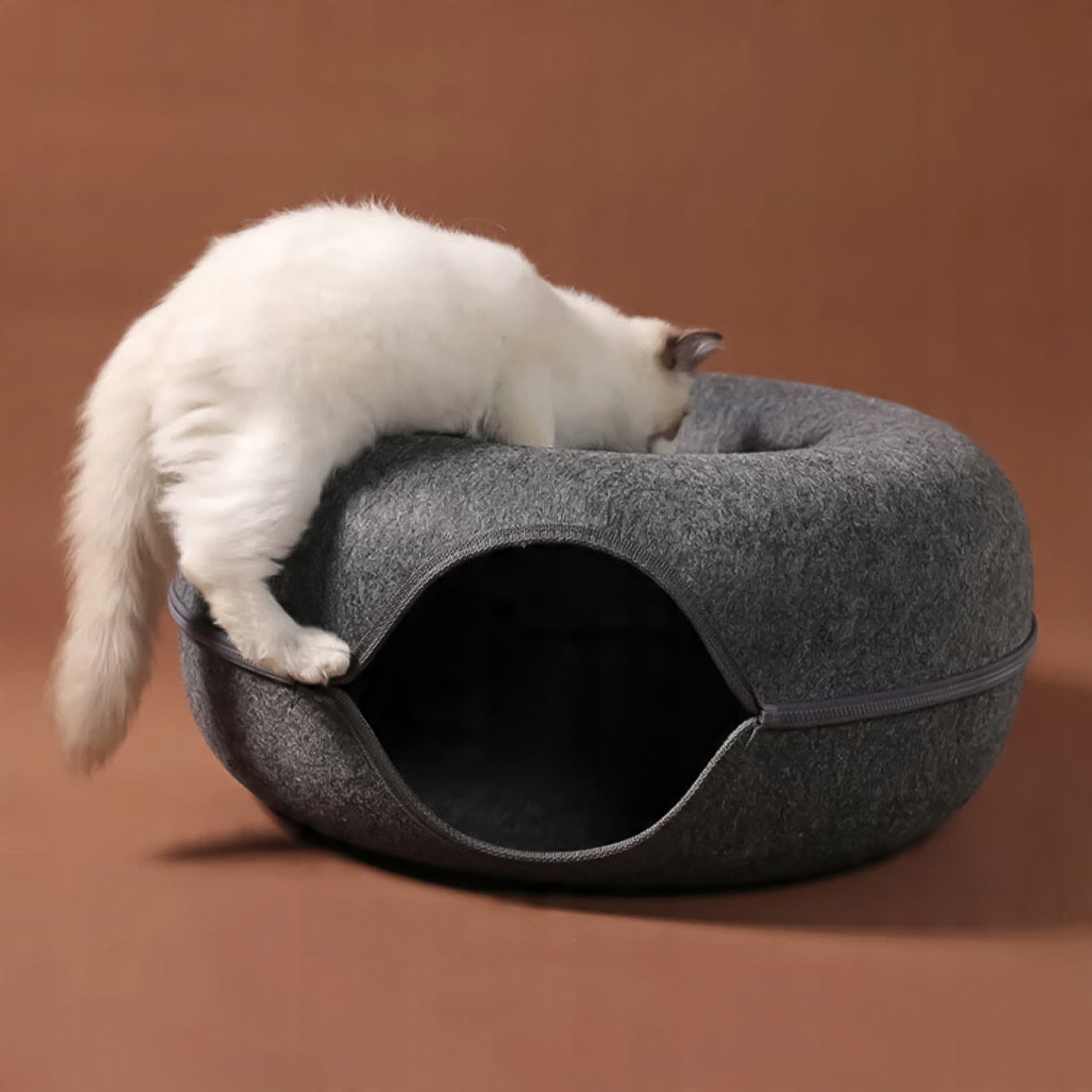 Кровать Donut — это инновационное и стильное решение для вашей кошки, сочетающее в себе функциональность традиционной лежанки с забавной туннельной формой. Этот уникальный продукт был разработан с учетом комфорта и удовольствия вашего питомца.