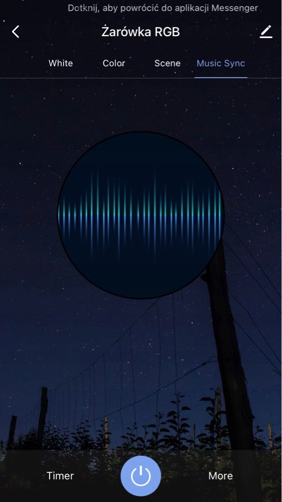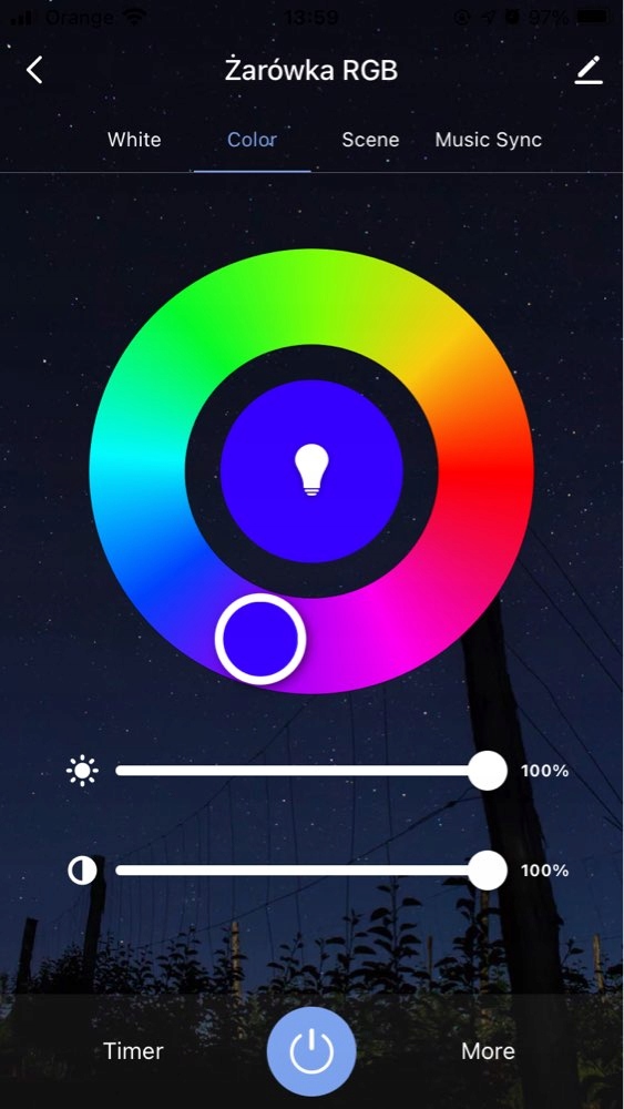Приложение позволяет нам полностью управлять лампочкой — мы можем изменять цвет света, уменьшать, настроить в соответствии с доступными сценами, выбрать один из запрограммированных типов освещения, создать индивидуальный профиль освещения или включить свет в ритме музыки. Кроме того, приложение имеет функцию таймера и запоминает настройки. Мы также можем объединять продукты в группы и управлять ими одновременно, а также делиться возможностью управления ими с другими людьми.