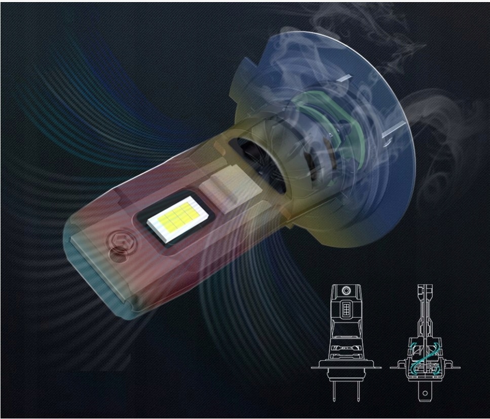 - ЕДИНСТВЕННАЯ в своем роде, уникальная компактная конструкция с турбинной системой охлаждения в корпусе, позволяющая устанавливать там, где другие светодиодные лампы не помещаются