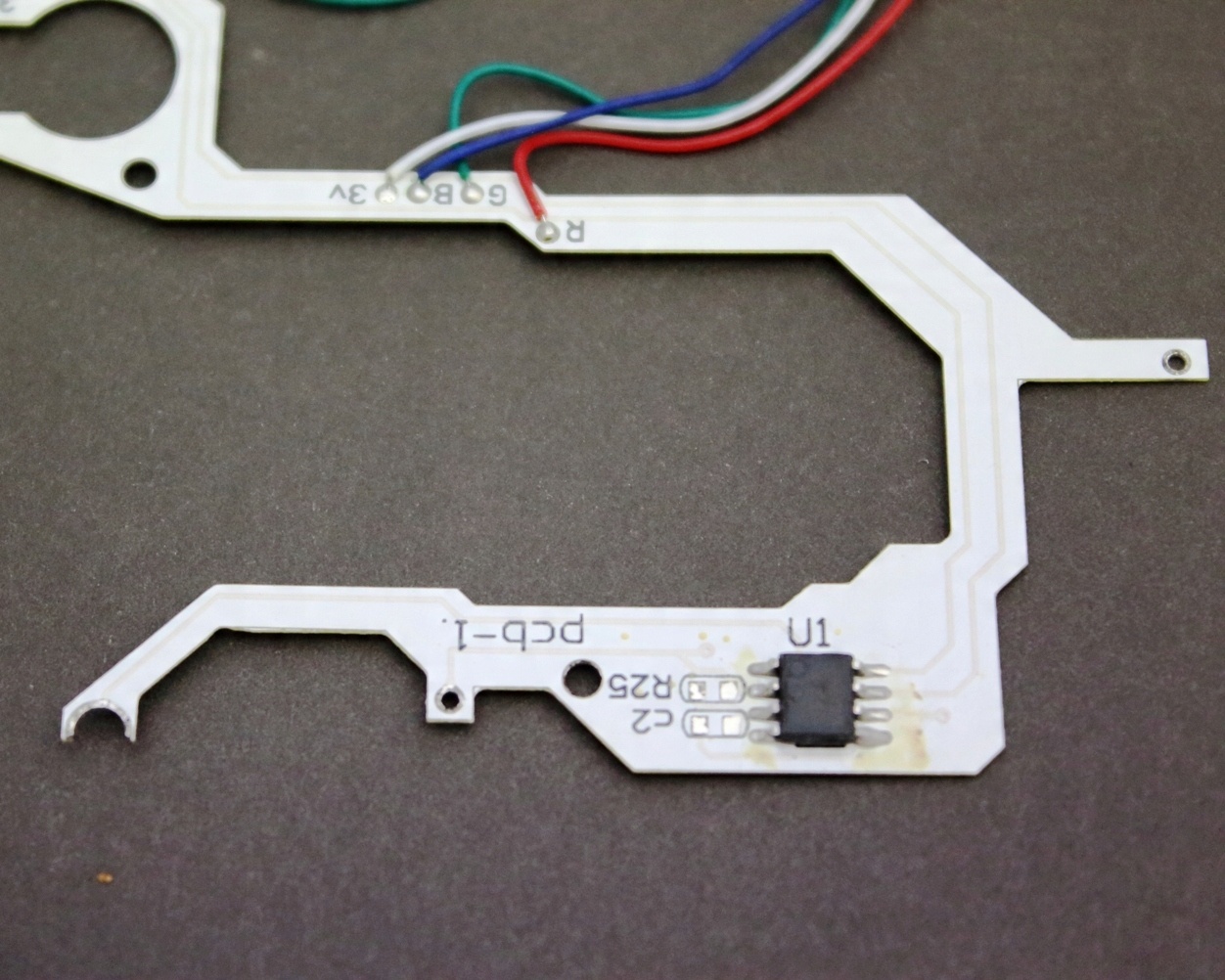 Для работы просто подключите источник питания к двум точкам, указанным на фотографии, к сожалению система настолько проста, что работает все время, пока на нее подано питание и не может управляться ни в каком виде. способ. Цвета подсветки меняются динамически и случайным образом (презентация в видео - ссылка ниже):