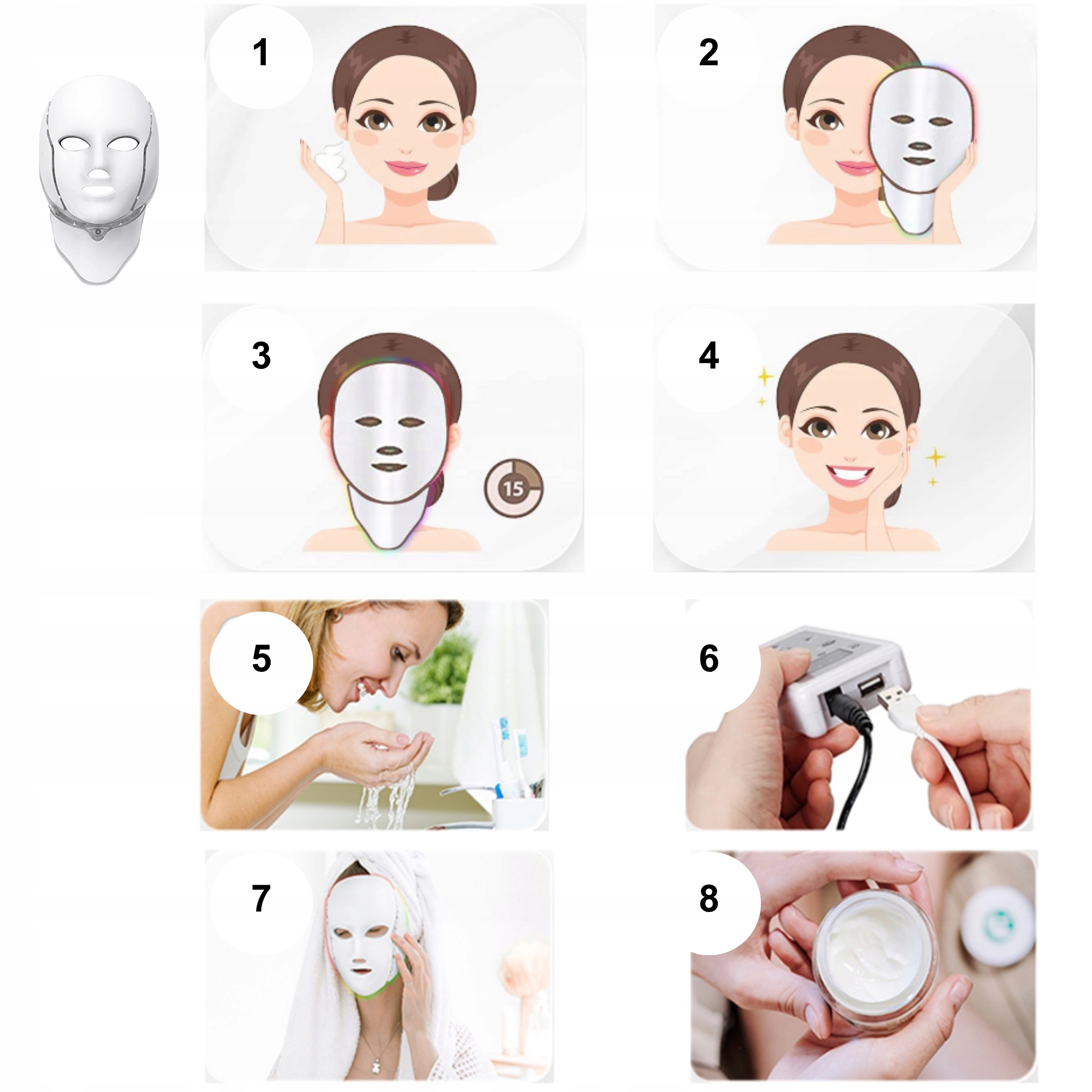 7️⃣ Регулярность: Для достижения наилучших результатов рекомендуется использовать светодиодную маску регулярно — от 2 до макс. 3 раза в неделю