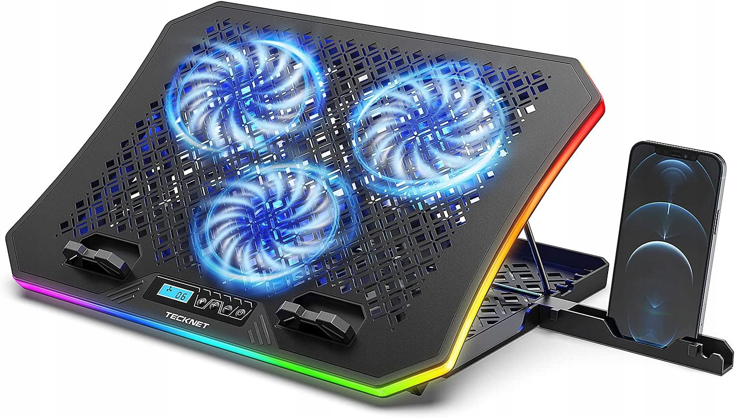 Кулер для ноутбука TECKNET 9–17 дюймов с RGB-подсветкой, бесшумная вентилируемая подставка для ноутбука с держателем для телефона.