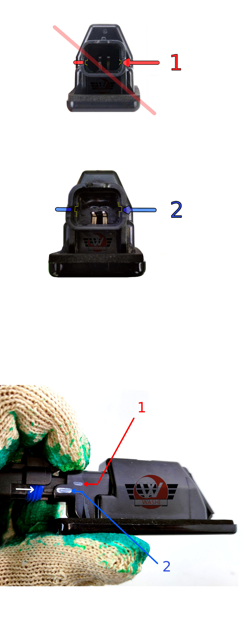 - Поскольку в некоторых моделях автомобилей могли использоваться разные типы панельных ламп, перед покупкой убедитесь, что направляющие штекеров в старой подсветке не находятся на той высоте, что на фото (зачеркнуто), красного цвета. нет (1). Если да, то для их установки необходимо снять (спилить) направляющие заглушки.