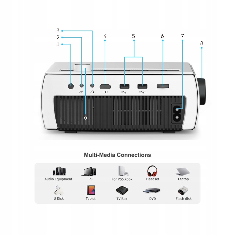 Легкое и удобное в переноске устройство, которое сделает каждый вечер приятнее. Встроенный динамик позволяет использовать проектор без дополнительного оборудования. Проектор также имеет встроенные входные порты USB, HDMI, AV и AUX.