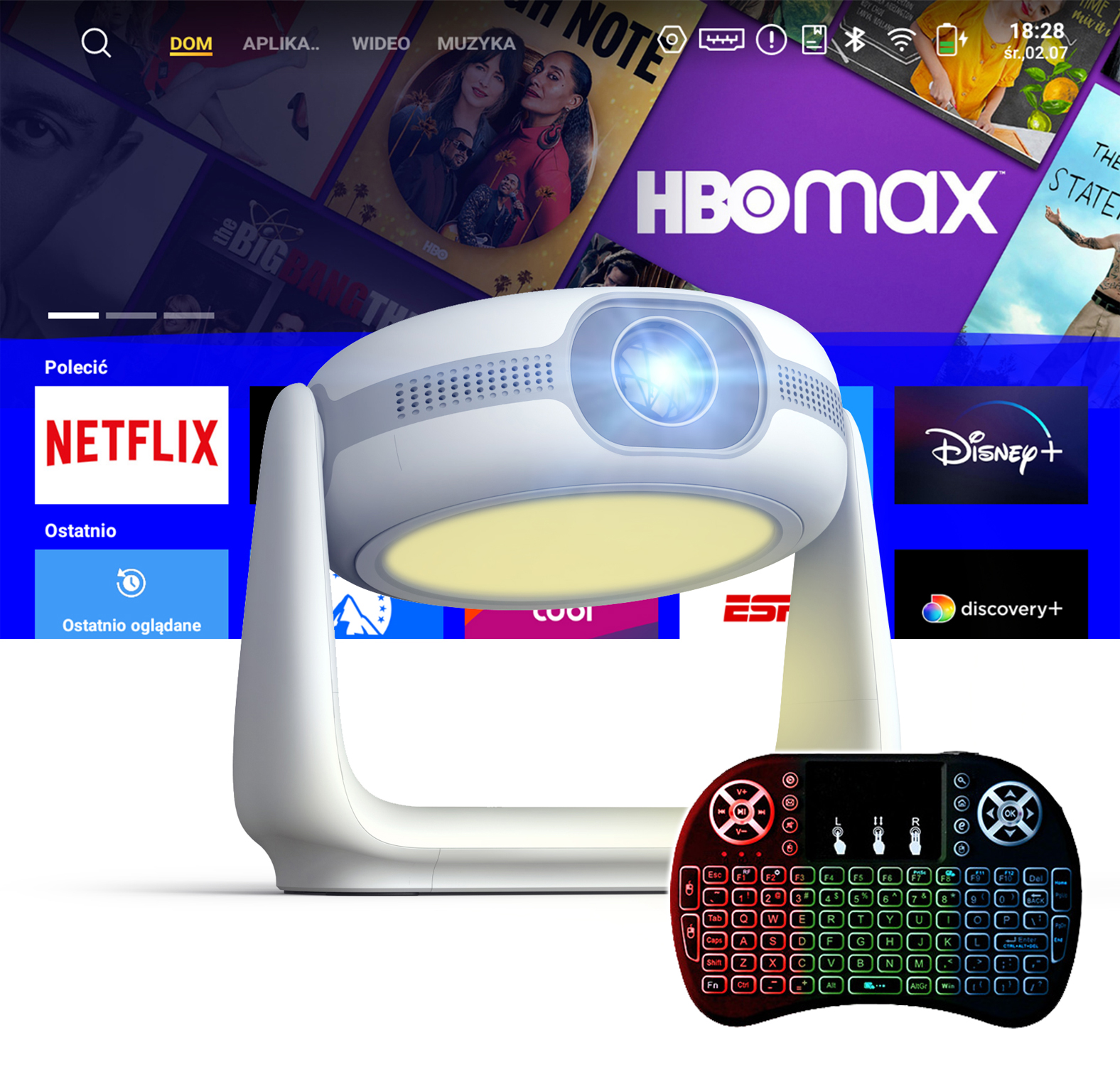 Проектор Rotary Projecter LED Android 11 Wi -Fi USB BT Auto Focus 10500LM Netflix YouTube Prime Video Disney+, Max ViaPlay / Constrult -IN Battery Keyboard < / H1>