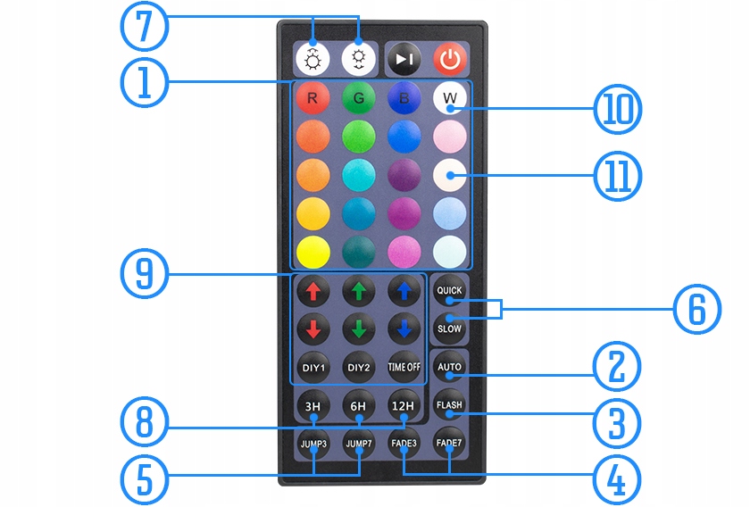 - 9. Собственные настройки - нажмите кнопку DIY1 или DIY2. Кнопки стрел соответствуют уровню насыщения отдельных цветов: красный, зеленый, синий. Сопоставьте их в соответствии с вашими предпочтениями