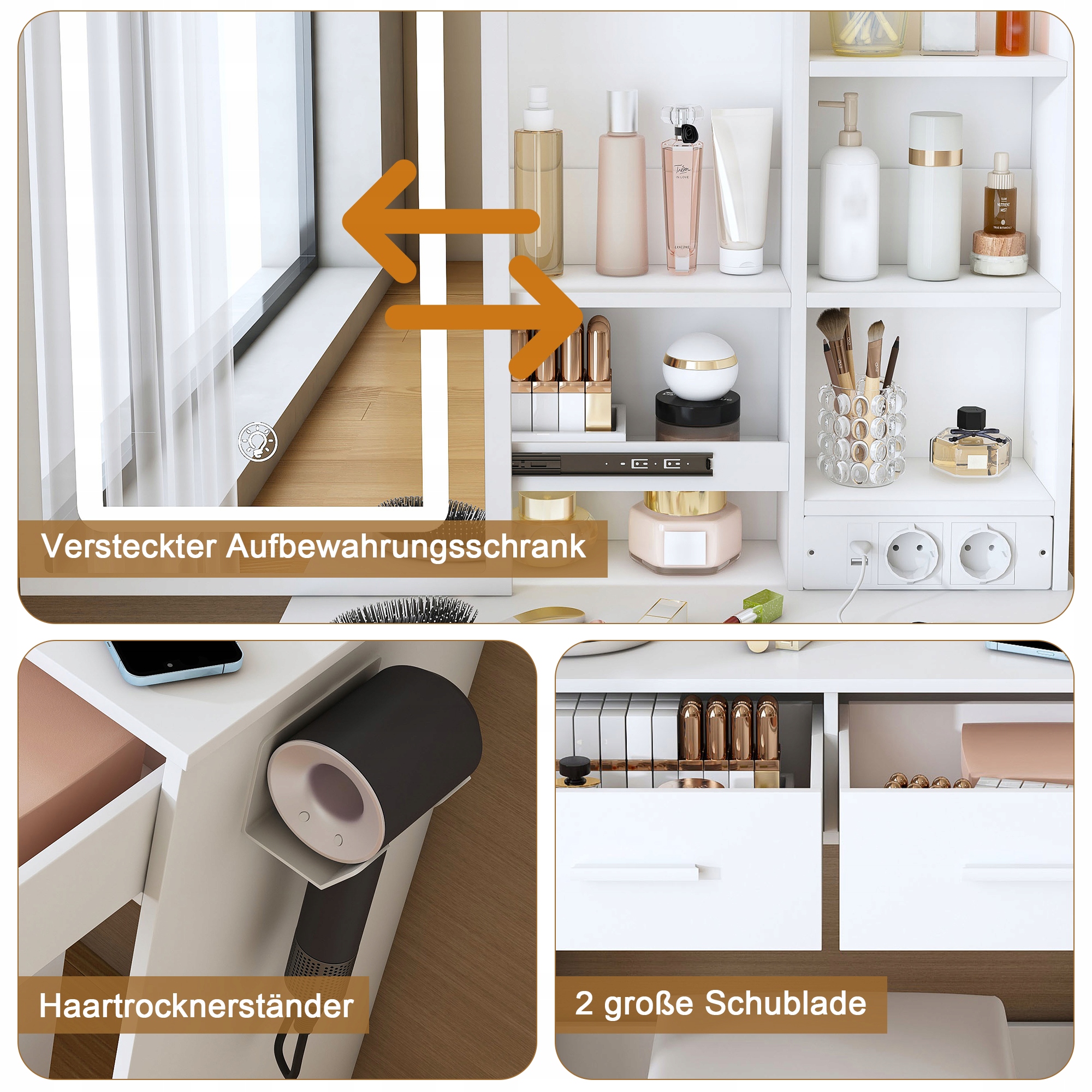 Маленький белый туалетный столик с зеркалом, регулируемым светодиодным освещением и розеткой - включает в себя мягкий табурет, скрытое место для хранения и полку - экономит место в небольших спальнях, Ш 60 x В 136/глубина 36 см.
