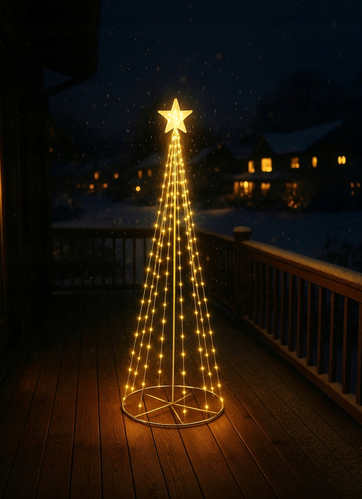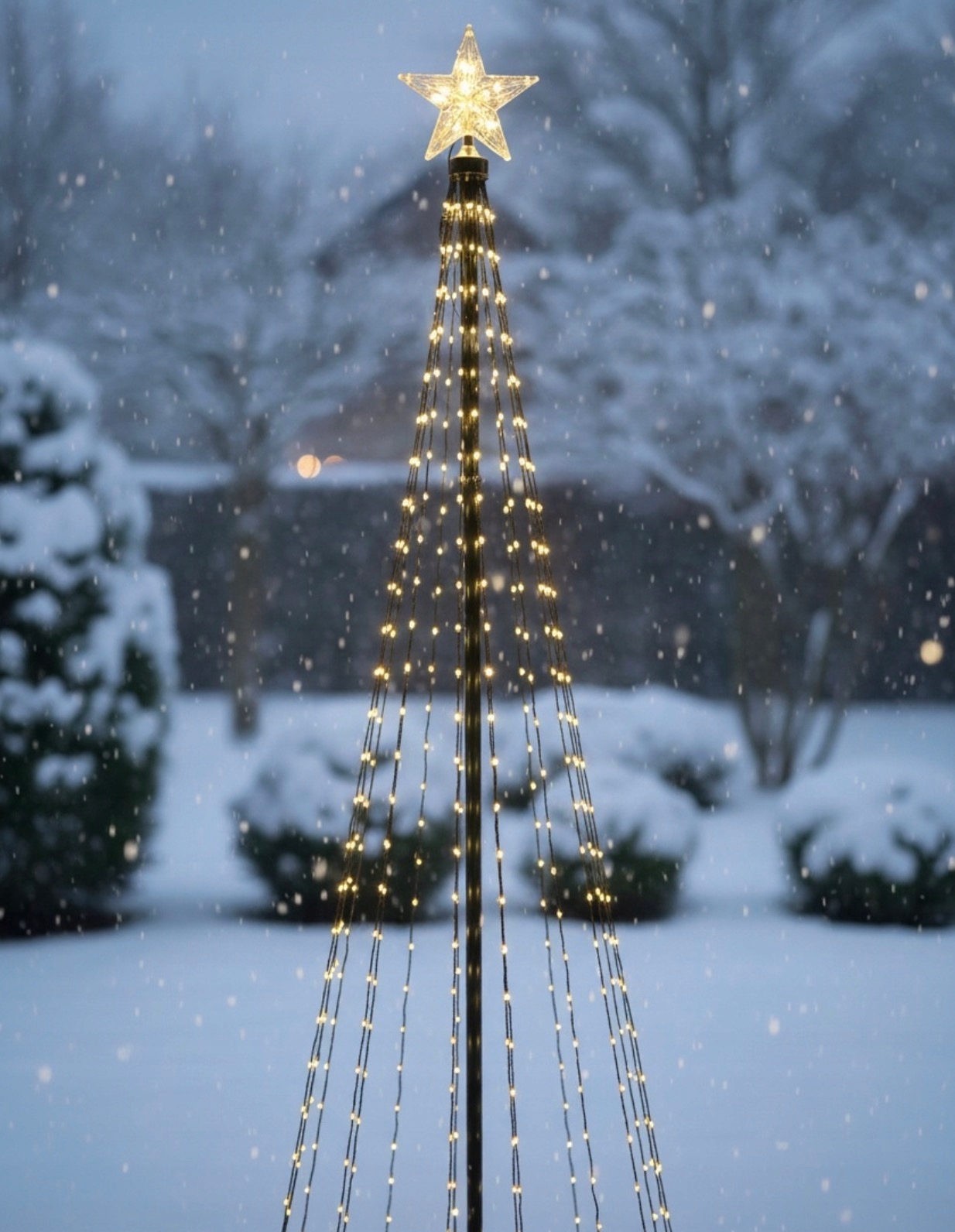 Представьте себе зимний вечер - теплый свет мягко вспыхивает на фоне снега, звезда на вершине сверкает и вокруг плывет спокойное сияние.