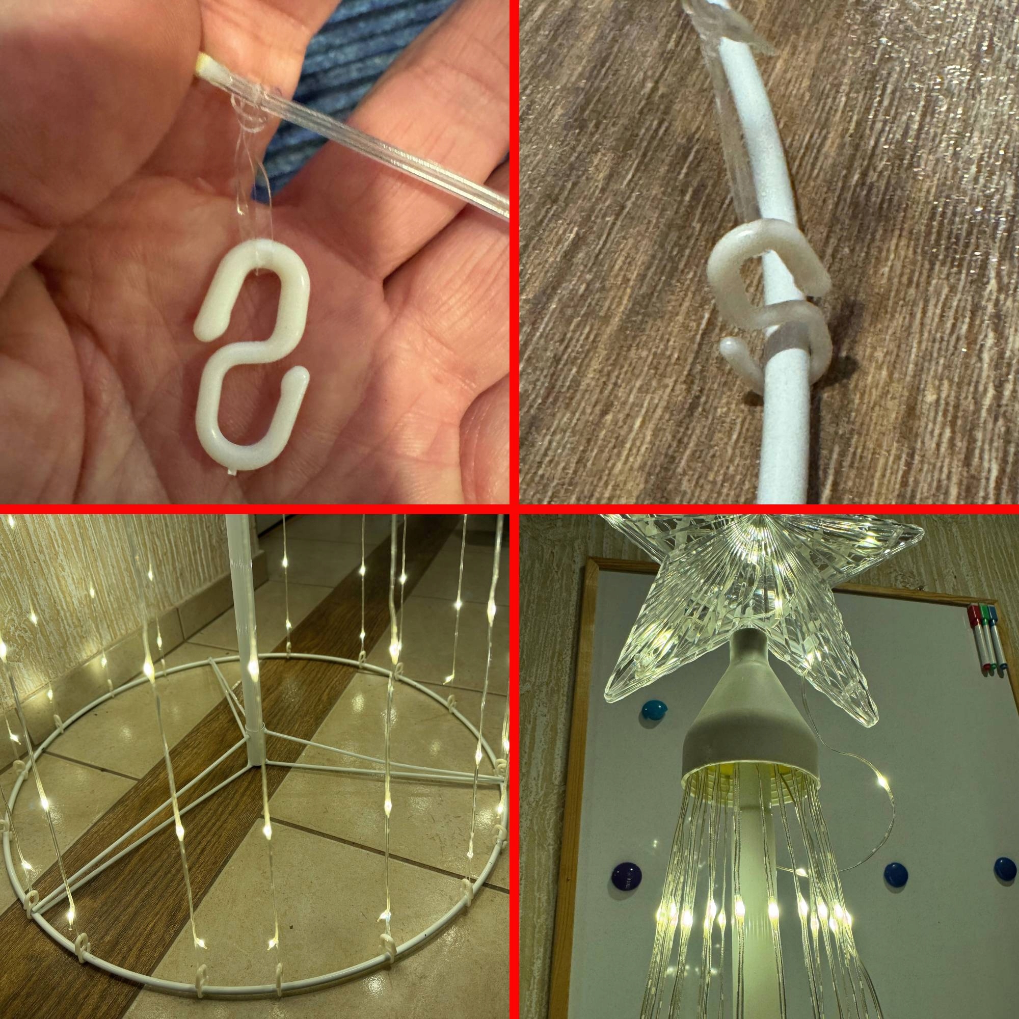Повторите ту же операцию (резинка → крючок → прикрепление к обручу) для каждой лески вокруг основания. Постарайтесь соблюдать одинаковые расстояния между крючками, чтобы елочка создавала красивый, ровный конус света - как на последнем фото.