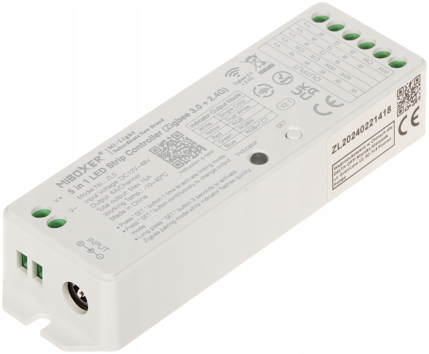 Контроллер освещения Zl5 предназначен для управления включением переключения, яркости света и цвета пятиканальных светодиодных лент RGB+CCT (RGBWW). Управление контроллером возможно через сеть Wi-Fi с использованием мобильного приложения Miboxer и использования беспроводного пульта дистанционного управления, работающего в полосе 2,4 ГГц (доступно отдельно). Светодиодный контроллер Zigbee 3.0 имеет возможность изменить частотную модуляцию ШИМ. Встроенная функция пожимания позволяет вам достичь неограниченного диапазона, просто удерживайте расстояние 30 м между последующими устройствами Miboxer. Zigbee - это обычно используемый протокол передачи данных с низким энергопотреблением. Благодаря защищенной передаче, она используется в системах мониторинга, он успешно работает с интеллектуальными решениями - гнездами, колокольчиками, различными типами датчиков и т. Д. Контроллер ZL5 может работать в одном из 5 режимов: RGB + CCT. RGBW. RGB. 2 X CCT. 5 x W. Драйверы Miboxer позволяют разделить освещение на максимум 4 зоны и независимое управление зоной с использованием пульта дистанционного управления. Благодаря функции ретранслятора, если между контроллерами сохраняется расстояние ≤30 м, можно перенести контрольный сигнал контроллерам вне диапазона прямых пилотов.