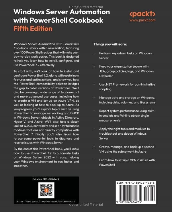 Используйте более 100 рецептов PowerShell 7.2, чтобы глубже понять Windows Server 2022 и узнать, как с легкостью автоматизировать распространенные задачи администрирования. При покупке печатной книги или книги Kindle вы получаете бесплатную электронную книгу в формате PDF. Ключевые особенности Новое издание обновлено до последней версии PowerShell 7.2 и Windows Server 2022. Откройте для себя новые способы оптимизации кода PowerShell, работая с простыми рецептами. Изучите PowerShell лучше всего. практики по автоматизации распространенных задач и управлению DHCP в Microsoft Windows Server, объектах в Active Directory, Hyper-V и Azure. Описание книги Книга рецептов автоматизации Windows Server с помощью PowerShell вернулась с новым изданием, содержащим более 100 рецептов PowerShell, которые облегчат вашу повседневную работу. Цель этой книги — помочь вам научиться эффективно устанавливать, настраивать и использовать PowerShell 7.2. Для начала мы рассмотрим, как установить и настроить PowerShell 7.2, а также новые полезные функции и оптимизации, а также покажем вам, как решение совместимости PowerShell устраняет разрыв со старыми версиями PowerShell. Мы также рассмотрим широкий спектр фундаментальных и более сложных вариантов использования, в том числе создание виртуальной машины и настройку VPN Azure, а также рассмотрим способы резервного копирования в Azure. По мере продвижения вы изучите такие темы, как использование PowerShell для управления сетью и DHCP в Windows Server, объекты в Active Directory, Hyper-V и Azure. Мы также более подробно рассмотрим WSUS, контейнеры и посмотрим, как обращаться с модулями, которые напрямую не совместимы с PowerShell 7. Наконец, вы также узнаете, как использовать некоторые мощные инструменты для диагностики и решения проблем с Windows Server. К концу этой книги по PowerShell вы узнаете, как с легкостью использовать PowerShell 7.2 для автоматизации задач в Windows Server 2022, помогая вашей среде Windows работать быстрее и плавнее. Что вы узнаете Выполнение основных задач администрирования на Windows Server Обеспечьте безопасность своей организации с помощью JEA, групповых политик, журналов и Защитника Windows. Используйте .NET Framework для административных сценариев. Управляйте данными и хранилищем в Windows, включая диски, тома и файловые системы. Составляйте отчеты о производительности системы. использование встроенных командлетов и WMI для получения отдельных измерений. Применение подходящих инструментов и модулей для устранения неполадок и отладки Windows Server. Создание второй виртуальной машины, управление ею и ее резервное копирование с использованием подсети в Azure. Узнайте, как настроить VPN в Azure с помощью PowerShell. эта книга для Эта книга предназначена для системных администраторов, архитекторов программного обеспечения, разработчиков, консультантов и инженеров, работающих с Windows Server 2022, которые хотят более эффективно автоматизировать задачи с помощью PowerShell 7.2. Прежде чем приступить к работе с этой книгой, вам необходимо освоить основы PowerShell и иметь элементарное представление о написании сценариев PowerShell. Оглавление Установка и настройка PowerShell 7 Управление PowerShell 7 на предприятии Изучение .NET Управление Active Directory Управление сетью Внедрение корпоративной безопасности Управление хранилищем Управление общими данными Управление печатью Исследование контейнеров Windows Управление Hyper-V Отладка и устранение неполадок Windows Server Управление Window Server с управлением окнами Инструментарий (WMI) для упра
