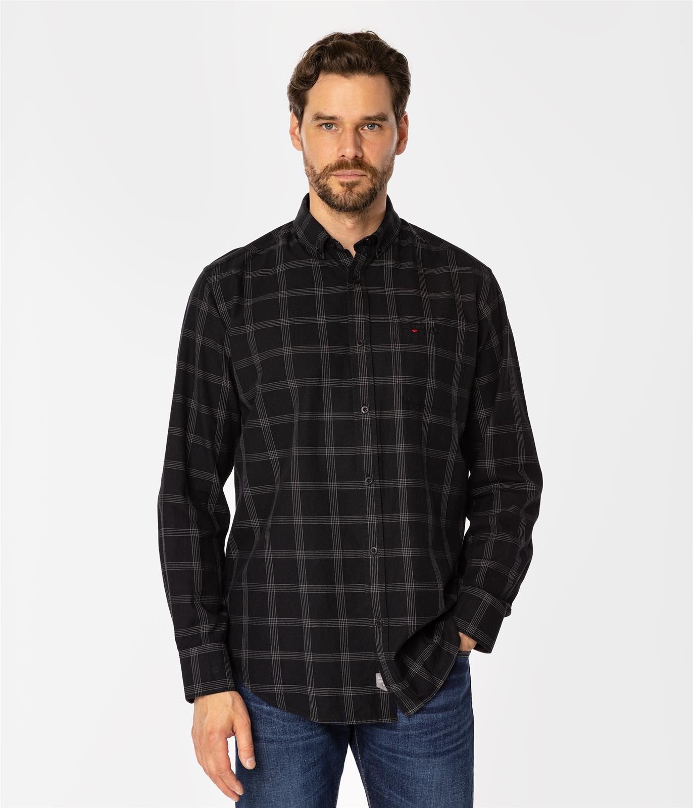Мужская рубашка с длинными рукавами свободного кроя (КОМФОРТНЫЙ крой) из 100% хлопка в клетку. Воротник на пуговицах. Карман на пуговицах. Спереди украшена тонкой фирменной вышивкой.