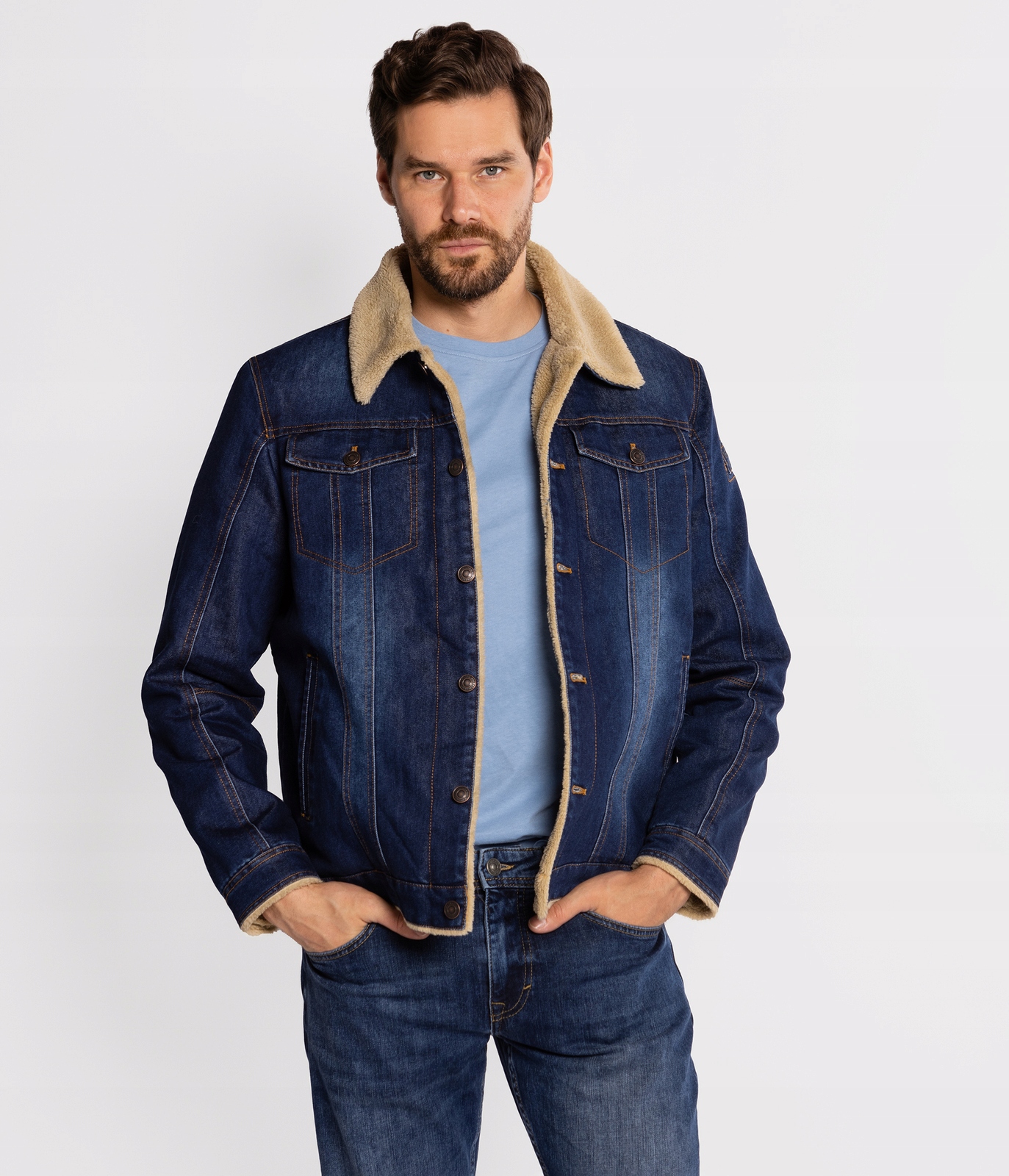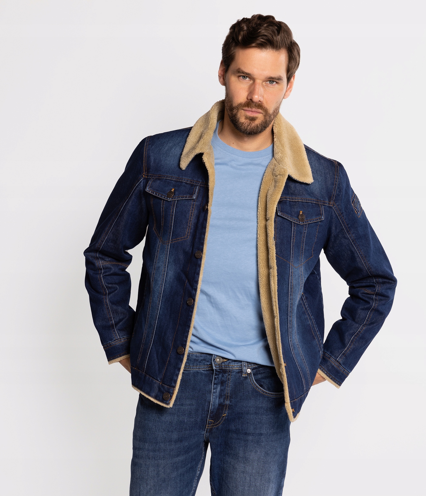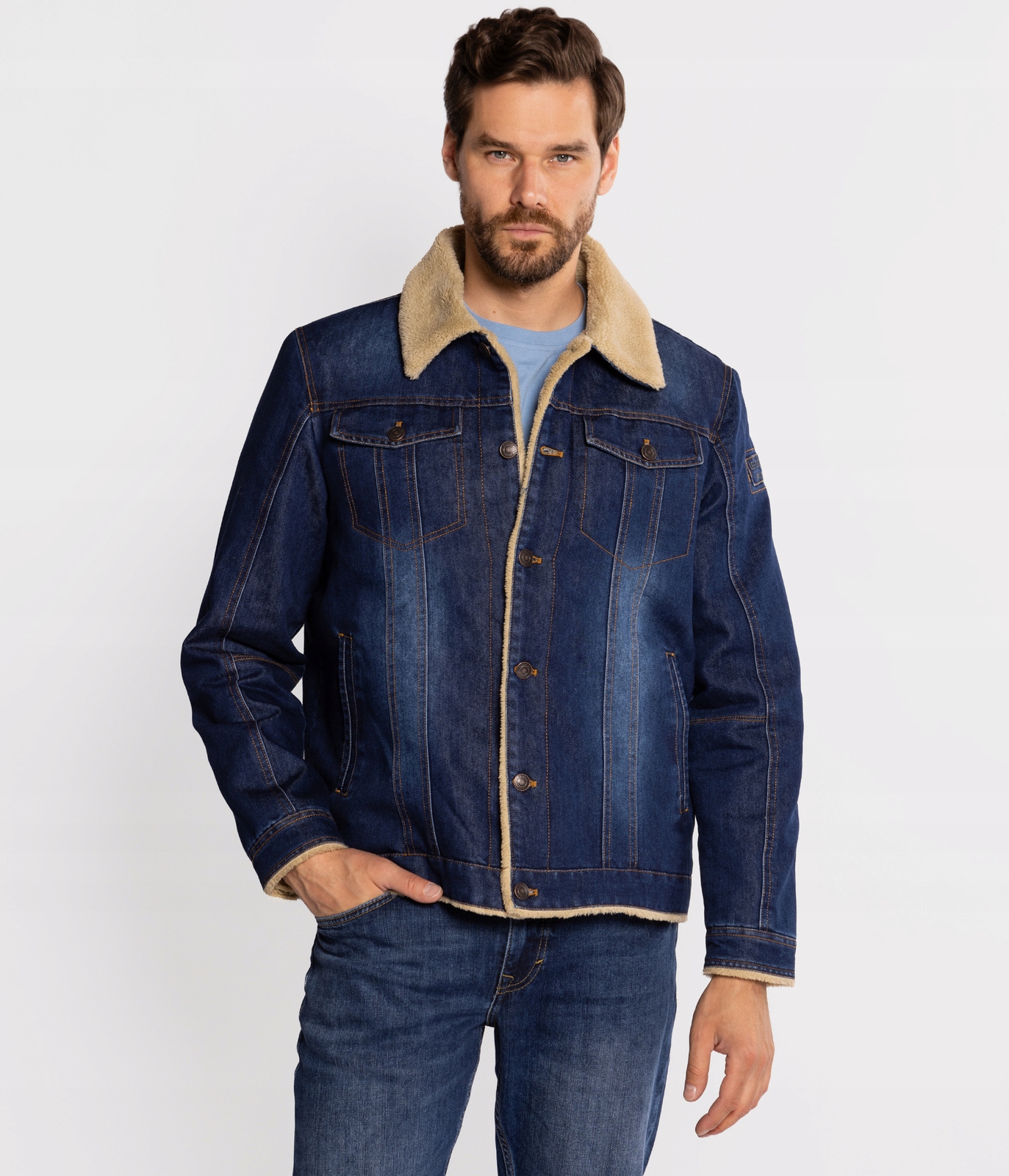 Мужская утепленная джинсовая куртка обычного кроя. Меховой воротник, застежка на пуговицы, два передних кармана с клапанами на пуговицах, открытые боковые карманы, планка на пуговицах, регулировка по низу спинки на пуговицах. На рукаве имеется небольшая нашивка с логотипом LEE COOPER.