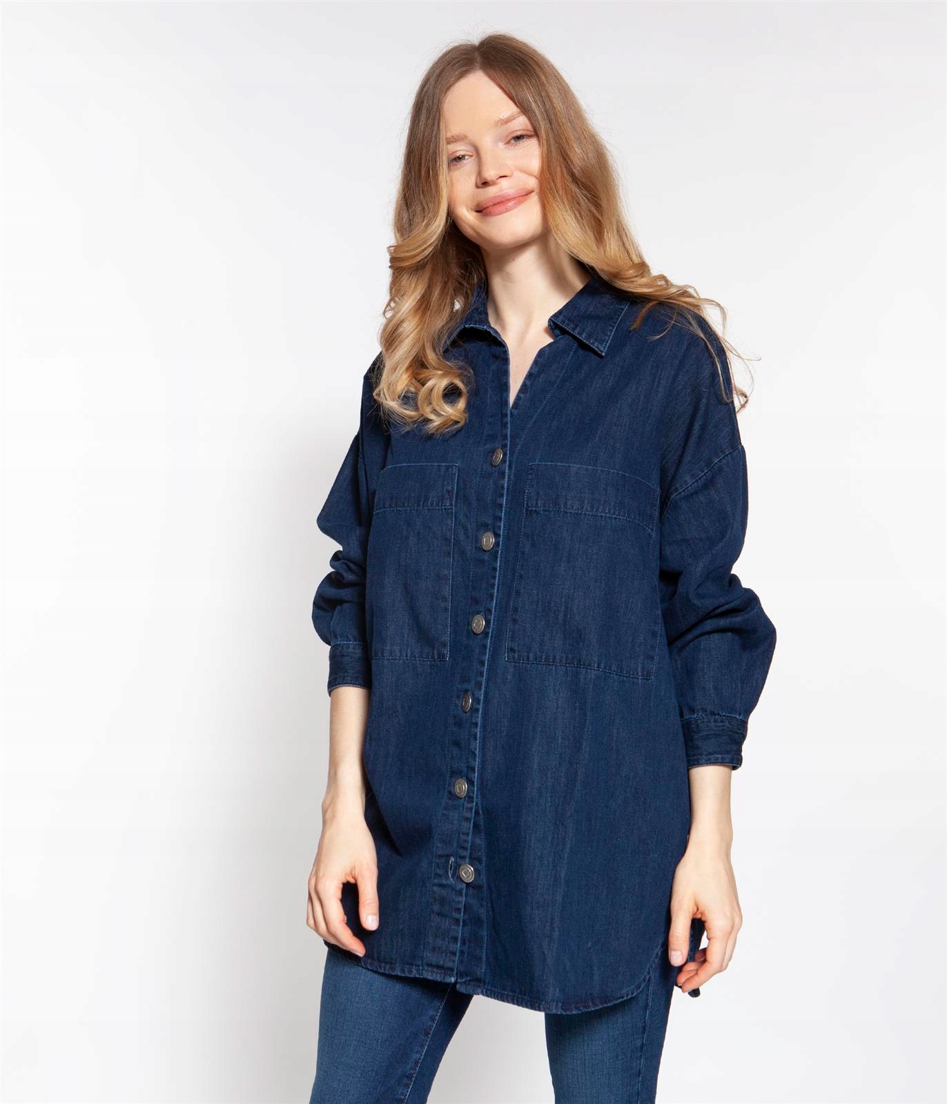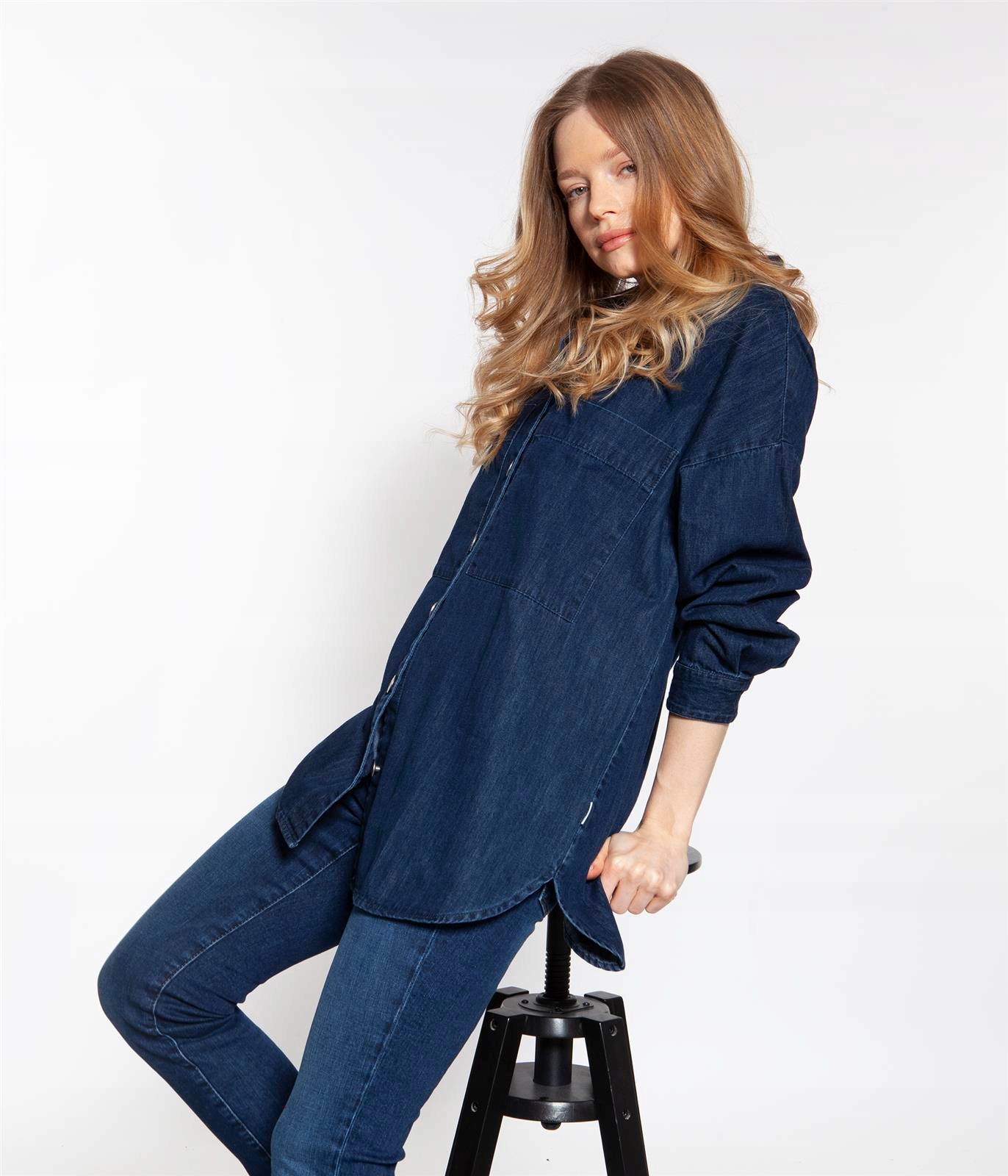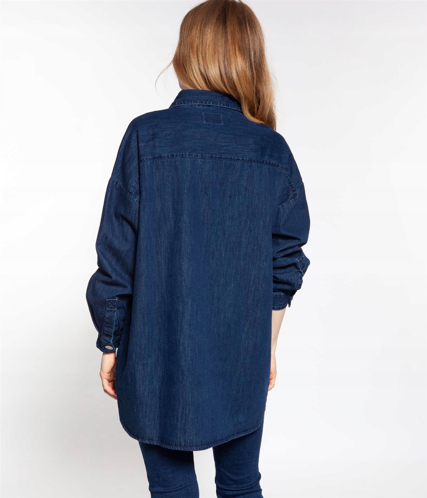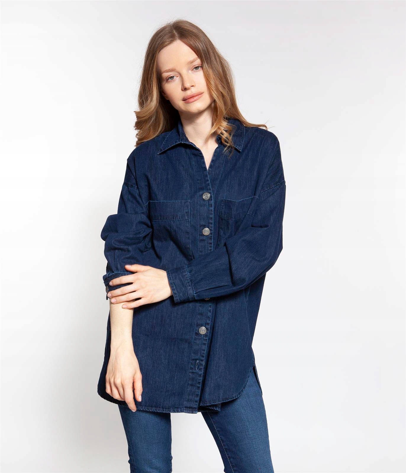 Женская джинсовая рубашка с длинными рукавами объемного кроя (посадка OVERSIZE). Длинный разрез. Изготовлен из 100% хлопка.