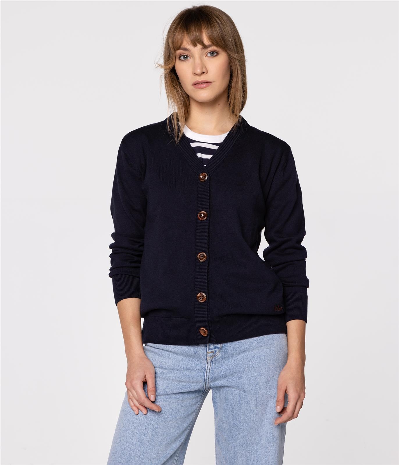Женский кардиган с контрастными пуговицами спереди, V-образным вырезом, манжетами по краям. Изготовлен из 100% хлопка. Внизу имеется небольшой логотип бренда Lee Cooper.