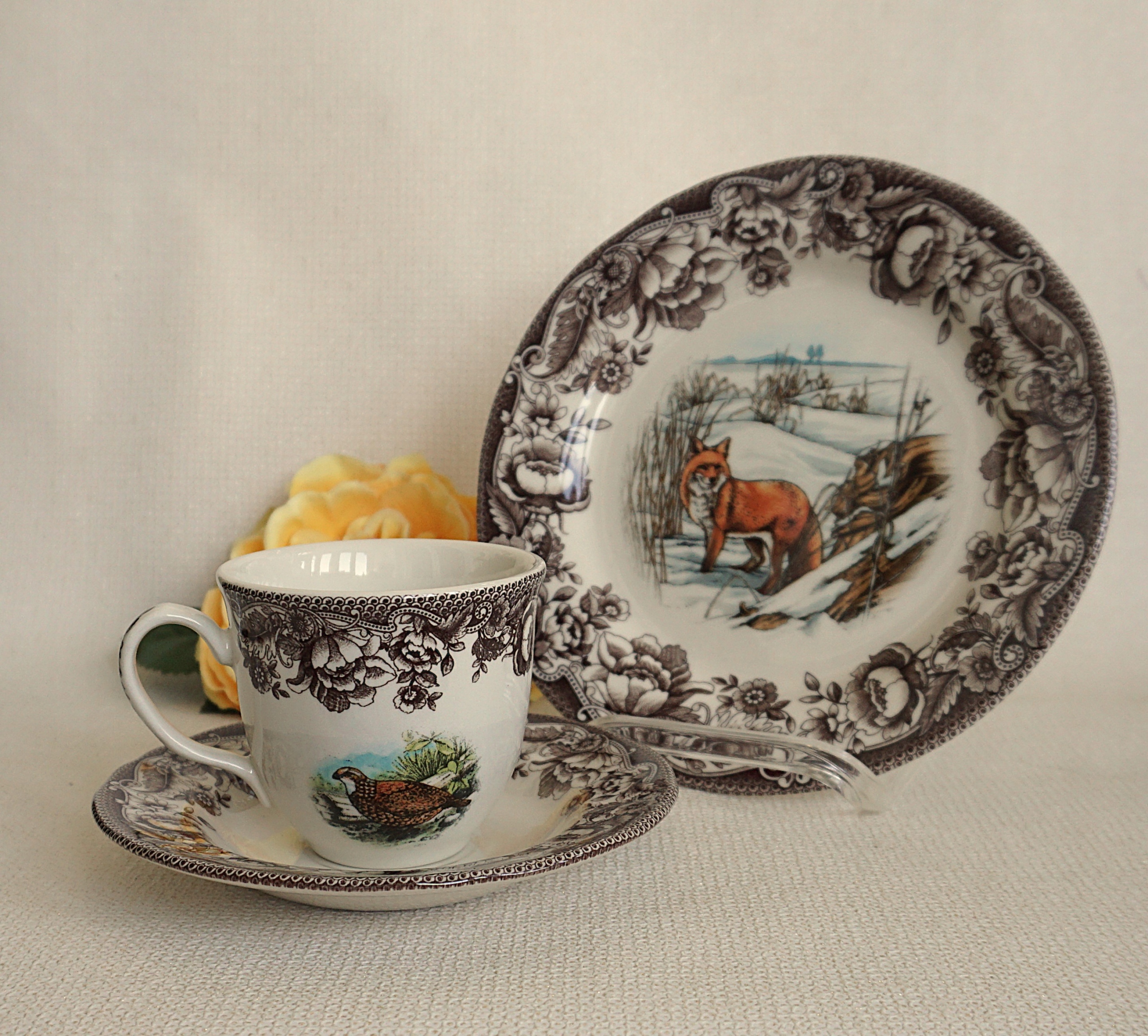 фарфоровый гладкий, блестящий. Отличное украшение: лесные животные в естественной среде. Otok каждого элемента широко оформлен коричневым овощным мотивом.