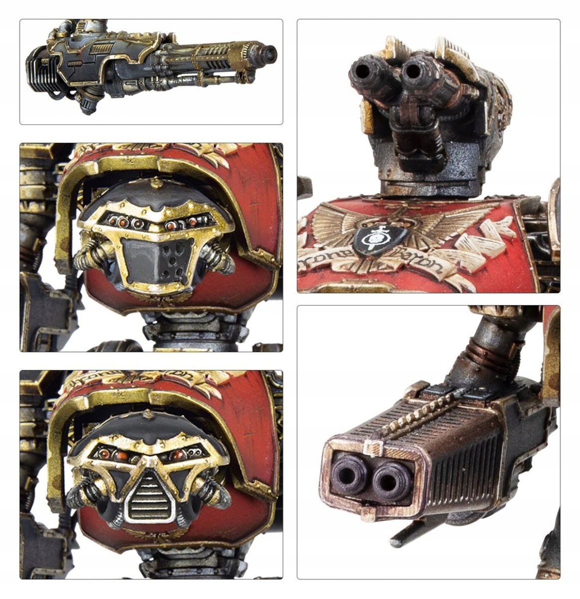 Этот комплект предлагает множество способов персонализации вашего Титана. На выбор вы найдете три различных лицевых панели, пустой панцирь или панцирь с богато украшенной скульптурой, дополнительный наколенник с символом Опус Титаникус и три пары наплечников — один со скульптурным дизайном Великого крестового похода, другой с изображениями предателей и один остался пустым. В комплект также входят шарниры в различных точках, что позволяет расположить Титана в положении головы, коленей, талии и т. д.