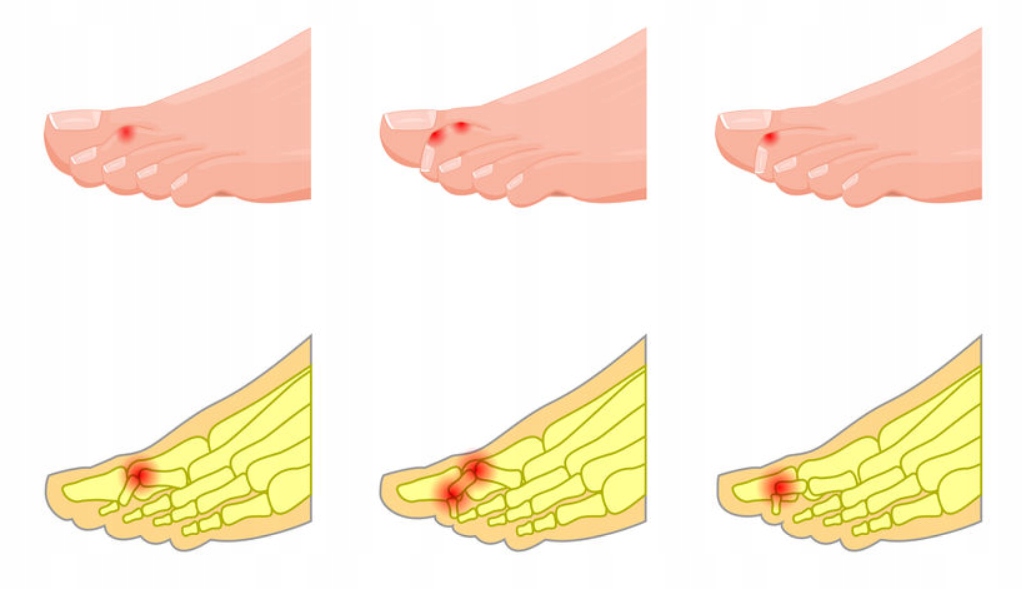 - Симптомы включают сгибание пальцев ног вниз. и образование мозолей на кончиках пальцев, мозолей в месте соединения пальца стопы со стопой и боли, иррадиирующей в плюсневую кость, ограничивающей возможность движения.
