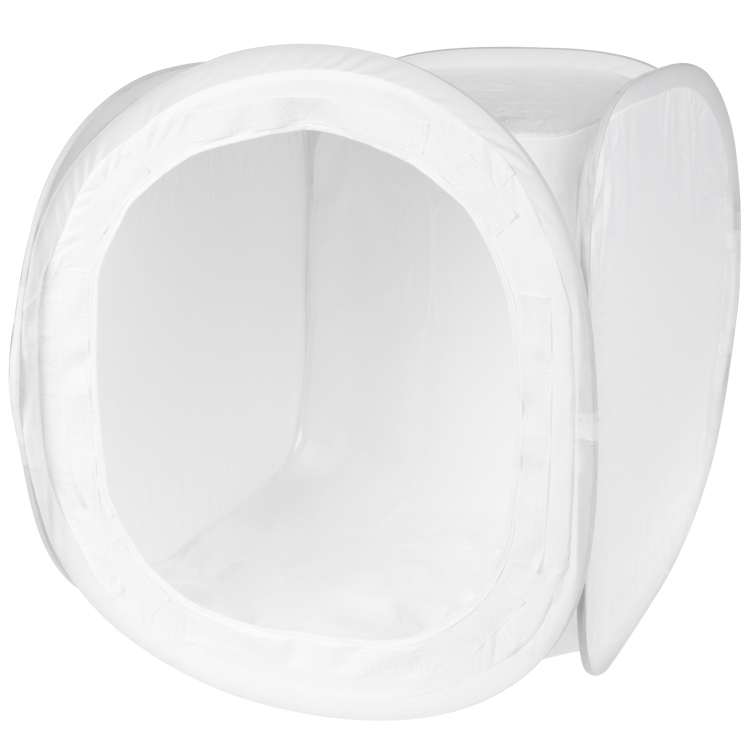 Бестеневая палатка со стороной 75 см, изготовленная из очень тонкого диффузионного материала. Благодаря свойствам ткани, из которой изготовлена палатка, можно получить фотографии предметов без теней и отражений. Полупрозрачный белый материал палатки сильно рассеивает свет. Он помогает устранить блики и отражения, а также смягчает свет, проникающий через стены палатки. Объекты, сфотографированные в помещении, освещены равномерно. Передняя стенка палатки крепится на липучке и также имеет отверстие для линзы. Установить и сложить палатку чрезвычайно просто. (На странице товара есть видео, показывающее, как раскладывать и складывать палатку — посмотрите). Фоны крепятся внутри палатки на липучке.