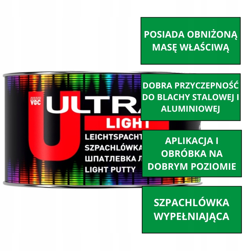 Светлый защелка - защелка. Благодаря использованию специального типа наполнителей, продукт имеет пониженный правильный вес. Применение и обработка находятся на хорошем уровне. Замазка также имеет хорошую адгезию к стали и алюминиевому листу.