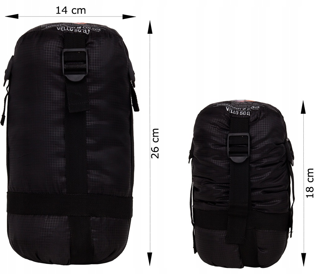 - Размеры спального мешка в сложенном виде: 14 х 26 (в сжатом виде: 18 х 14 см)
