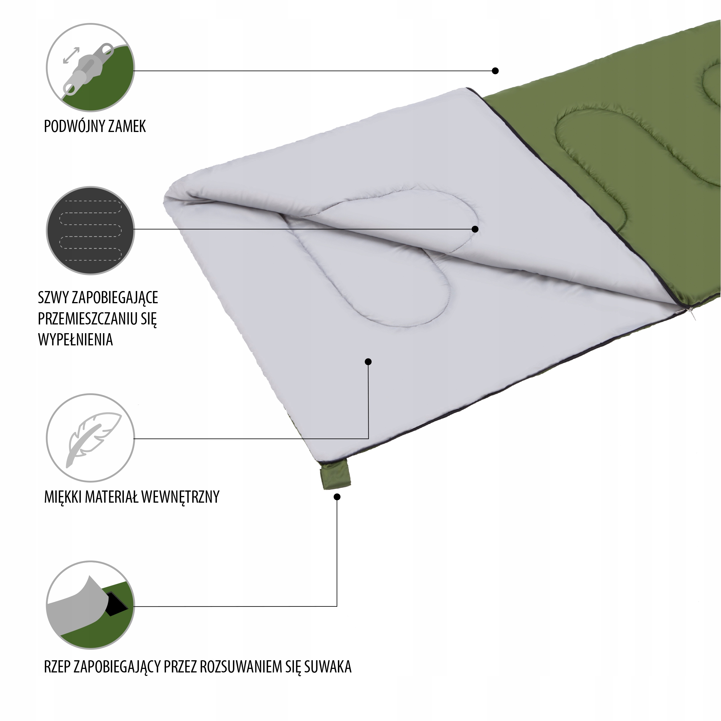 как наполненный, так и внешний материал являются долговечными и современными полиэфирными тканями b>. Кроме того, они покрыты покрытием, которое не позволяет холодно и влаге. Это приводит к спокойному, теплую сон даже при низких температурах. Для еще большего удобства использования спальный мешок имеет специальную строчку, чтобы предотвратить начинку начинки. nc2002 закрепляется с помощью Zipper , а vlebro , расположенной на его конце, защищает от распространения. Снижащий мешок расстегнут оба со стороны и снизу ..