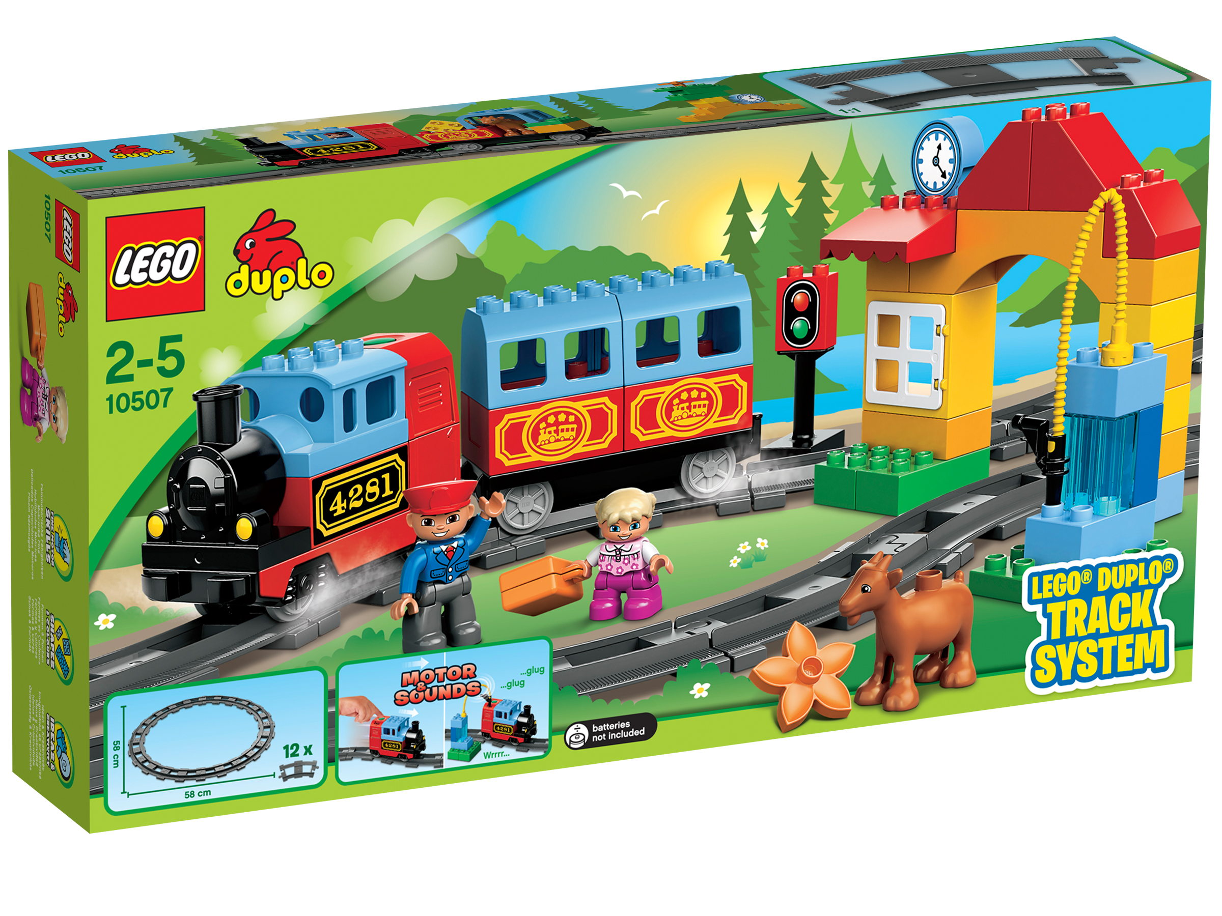 - также содержит паровой локомотив, выпускающий реалистичные звуковые эффекты, пассажирский универсал, станцию с наличными и часами, насос, сирена, блоки Duplo и более 55 см.
