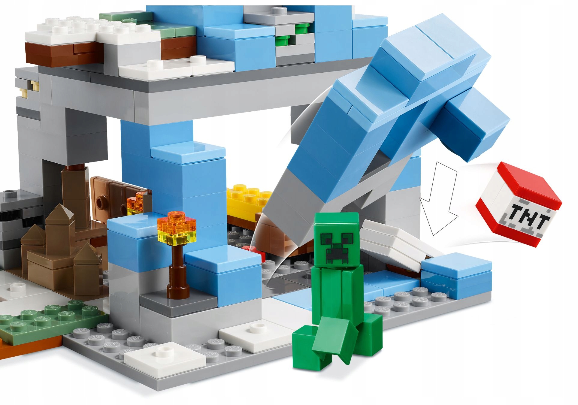 Игроки в Minecraft® пойдут в захватывающее приключение и выкопаете сырье Creeper ™ и блуждание, спрятанные в льдах, покрытых льдом. Много вещей, которые можно строить, сражаться, открыть и взорвать! Игроки Minecraft узнают снежные пики и тайгу и рады использовать свои навыки из игры, чтобы выявить уголь, железо и изумруды под льдом. Дети должны строить безопасную базу и собирать еду, прежде чем они начнут копать. Когда они знакомит, что они подходят слишком близко, дети могут избежать опасной проникновенной пещеры, использовать динамит, чтобы взорваться и добраться до базы или направить козу и бросить мобов утеса! Другие функции и аксессуары обеспечат бесконечное развлечение от Minecraft. Дополнительное цифровое развлечение будет предоставлено приложением Lego Builder, в котором вы можете увеличить и вращать модель при здании