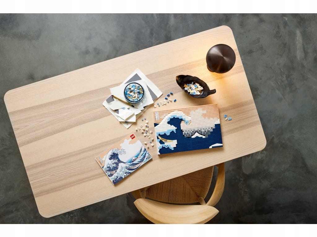 - Отличное украшение — модель LEGO® для взрослых, состоящая из 1810 деталей, включая шесть холщовых плиток, две вешалки, разделитель из кубиков и декоративную тарелку с подписью Хокусая.