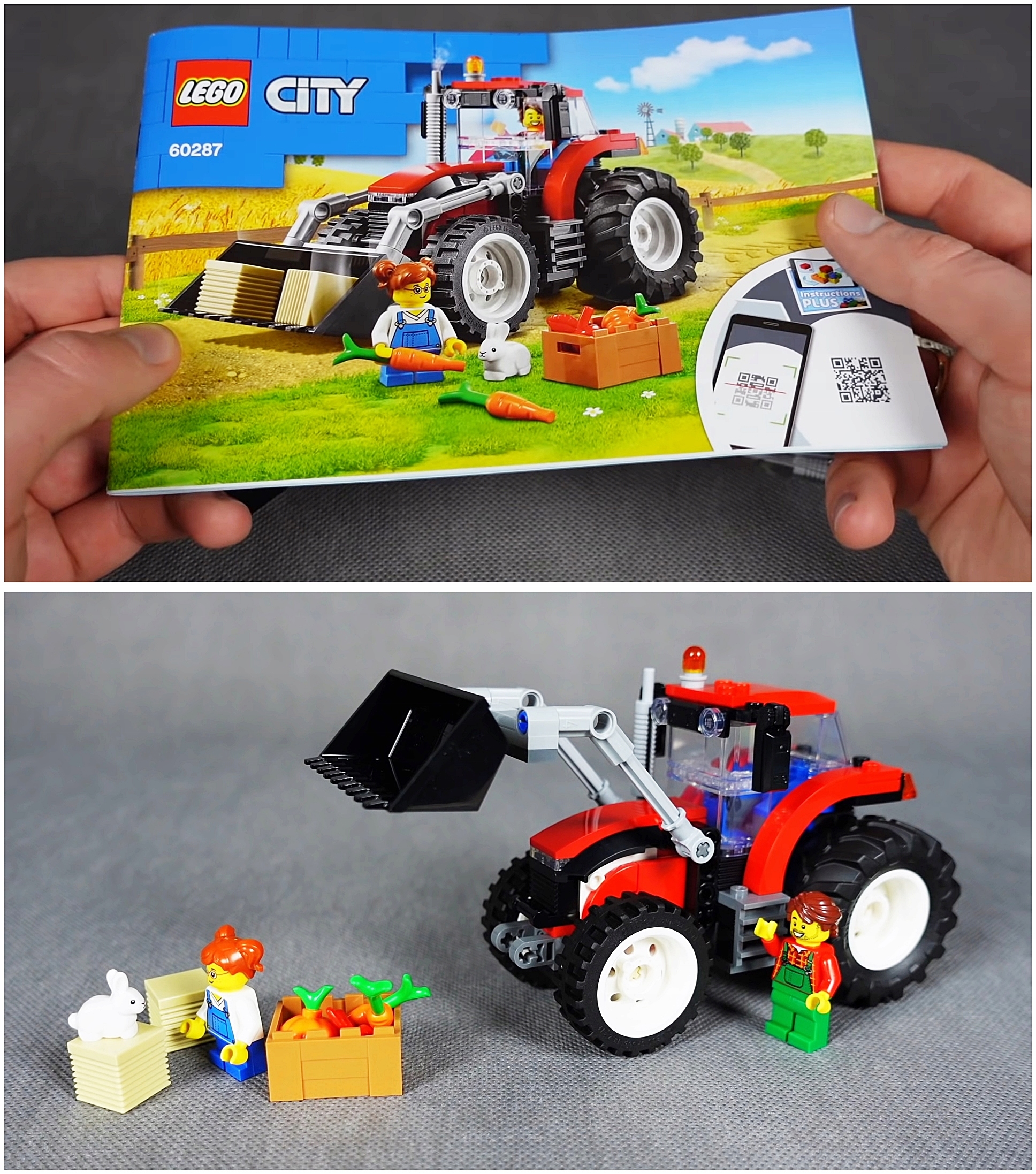 ➡️ В упаковке вы найдете две упаковки с деталями и инструкцией из мелованной бумаги. Большие колеса трактора и его подъемный ковш упакованы свободно.