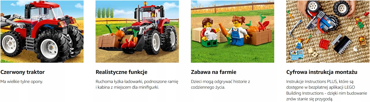 ➡️ В комплект входят: два вязанка сена, корзина, две морковки, тыква, красное яблоко, два минифигурки и мощный трактор.