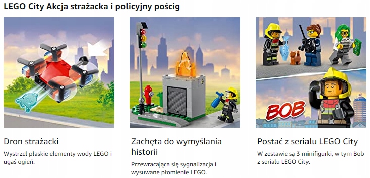 Заведите полицейский мотоцикл и поймайте убегающего вора,а потом помоги пожарному Бобу из сериала LEGO City, прибудь на место происшествия на пожарной машине и отправь удивительный дрон тушить пожар.