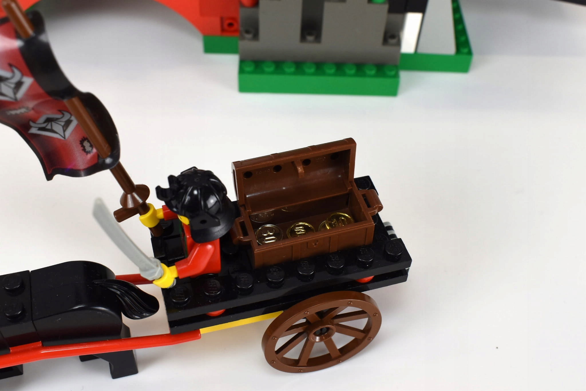 Состояние блоков: Использовались и играли, со следами зубов, небольшими царапинами, все оружие и аксессуары в комплекте, зеленая веревка в хорошем состоянии, белые блоки могут быть слегка пожелтевшими, все крючки целы, флаги в хорошем состоянии, набор монет