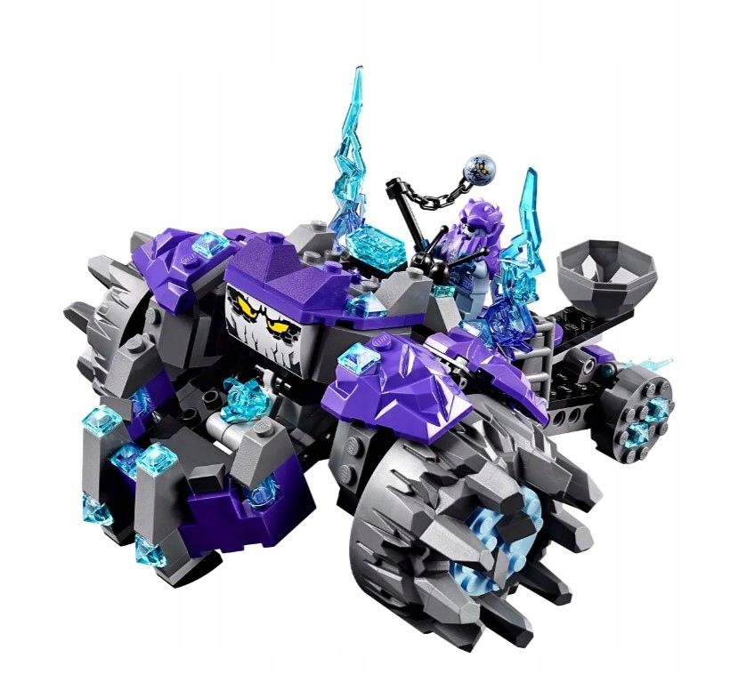 - В комплект входит транспортное средство-монстр с гибкими колесами, большим лицом, кабиной для двух минифигурок, открывающимися челюстями, катапультой, стреляющей сзади, двумя синими полупрозрачными элементами молнии и держателем щита.