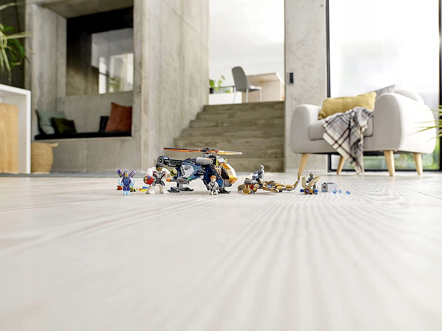 - В набор входят 4 минифигурки, крутая фигурка Халка, вертолет с тройными шипометами и возможностью выбрасывать Халка в бой, а также левиафан и летательный аппарат Читаури, стреляющий шипами, для эпических воздушных сражений.