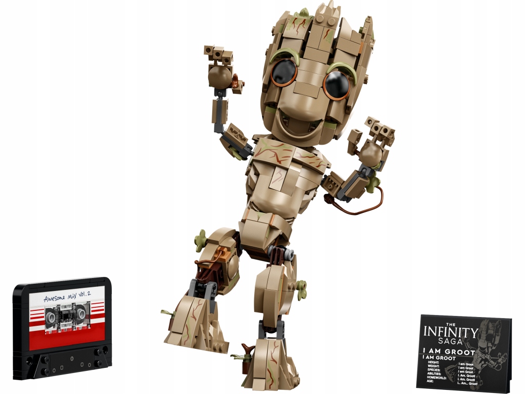 • Культовая фигура Marvel - дети могут построить свой собственный Groot, известный из «Guardians of the Galaxy Vol. 2». Набор также включает в себя кассету и тарелку с надписью