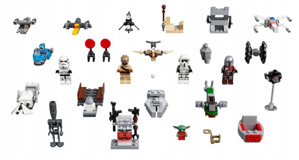 В Адвент-календаре представлены семь персонажей LEGO (минифигурки, фигурки и дроиды): одетые в праздничные костюмы, Мандалорец и ребенок (Грогу), также известный как Малыш Йода , а также штурмовик-разведчик, штурмовик, тускенский рейдер, IG-11 и дроид-дознаватель IT-O. Детям также понравится собирать мини-модели Пилы, TIE-истребителя, снежной баллисты Таскена, учебных мишеней и летающего корабля на воздушной подушке ребенка.