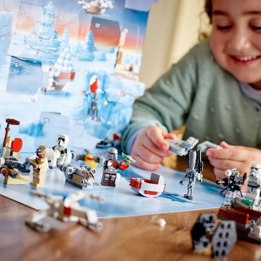 В Адвент-календаре представлены семь персонажей LEGO (минифигурки, фигурки и дроиды): одетые в праздничные костюмы, Мандалорец и ребенок (Грогу), также известный как Малыш Йода , а также штурмовик-разведчик, штурмовик, тускенский рейдер, IG-11 и дроид-дознаватель IT-O. Детям также понравится собирать мини-модели Пилы, TIE-истребителя, снежной баллисты Таскена, учебных мишеней и летающего корабля на воздушной подушке ребенка.