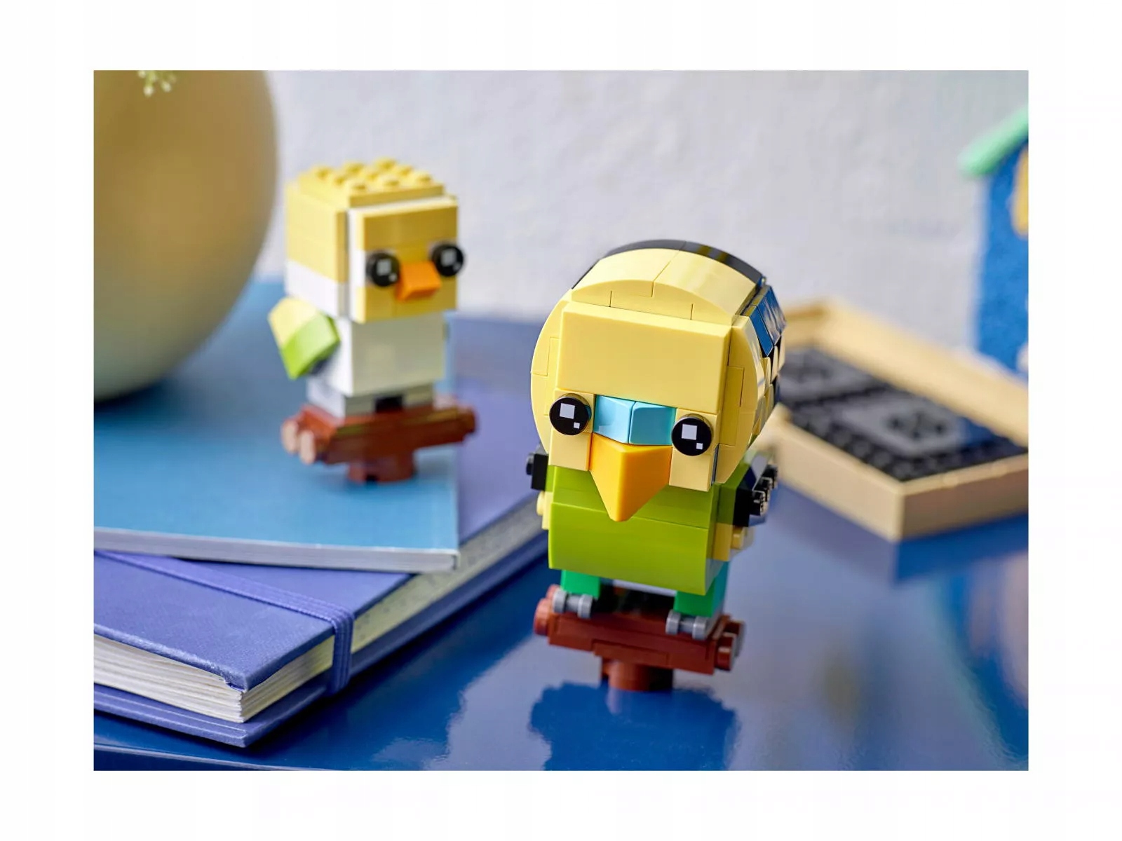 - Коллекционный набор с очаровательными моделями попугая и цыпленка LEGO® BrickHeadz™, которые сидят на подставках из кубиков, которые помещаются в основу в виде клетки.