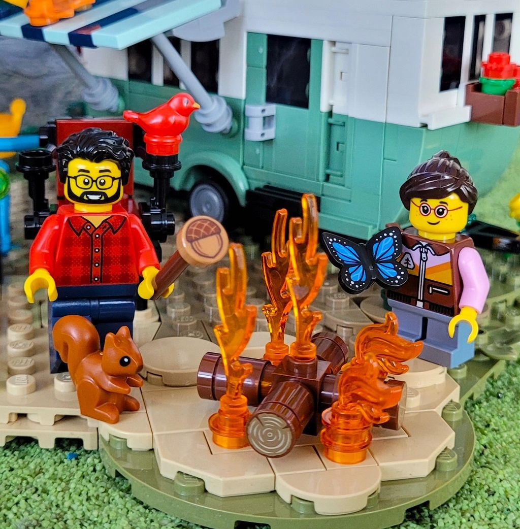 Двухцветный винтажный фургон оснащен рабочими дверями, прикрепленным навесом, кондиционером, сушилкой для одежды и смесителем. Внутри уютно и уютно, со всеми обычными удобствами, которые только можно ожидать, включая кухню с плитой, раковиной и кухонными принадлежностями; кровать размером с минифигурку и даже дополнительное место для хранения вещей!