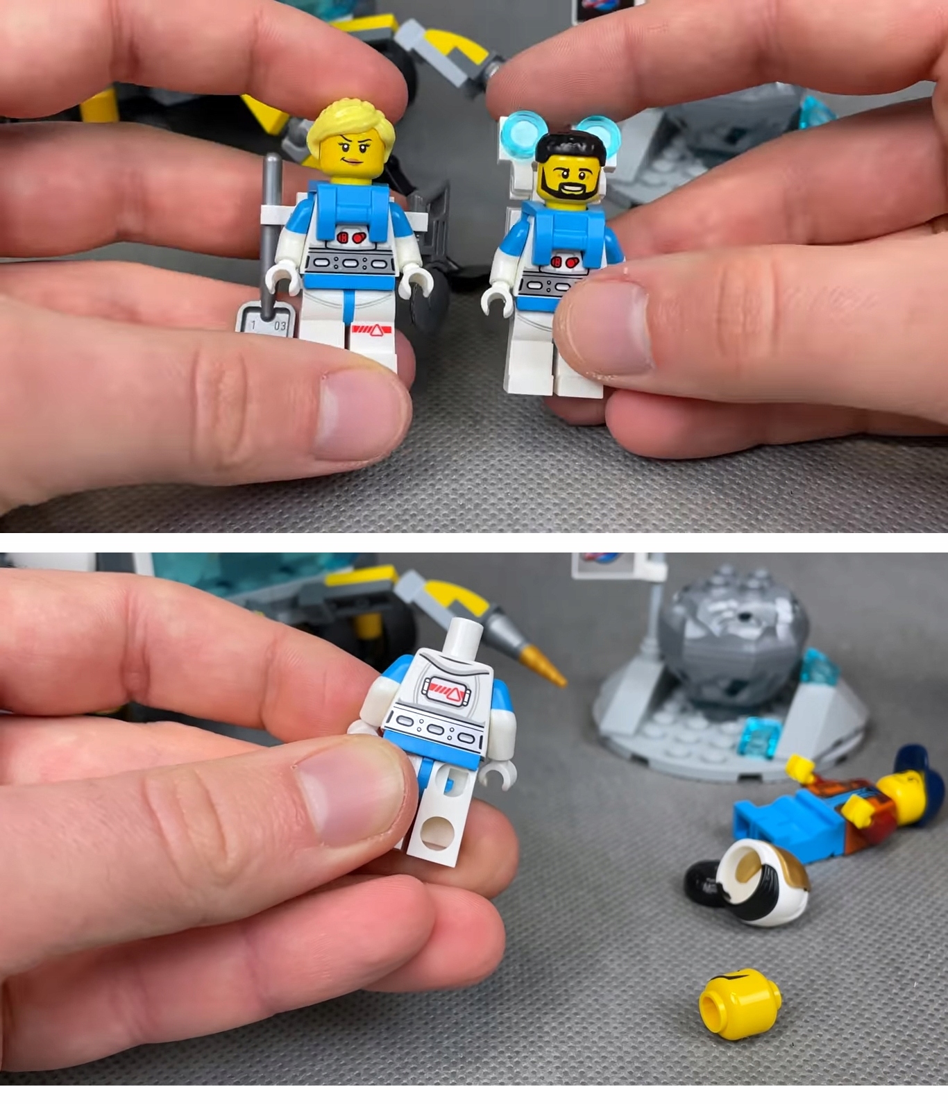 В набор входит луноход вездеход, фрагмент Луны с метеоритом и три минифигурки космонавтов.