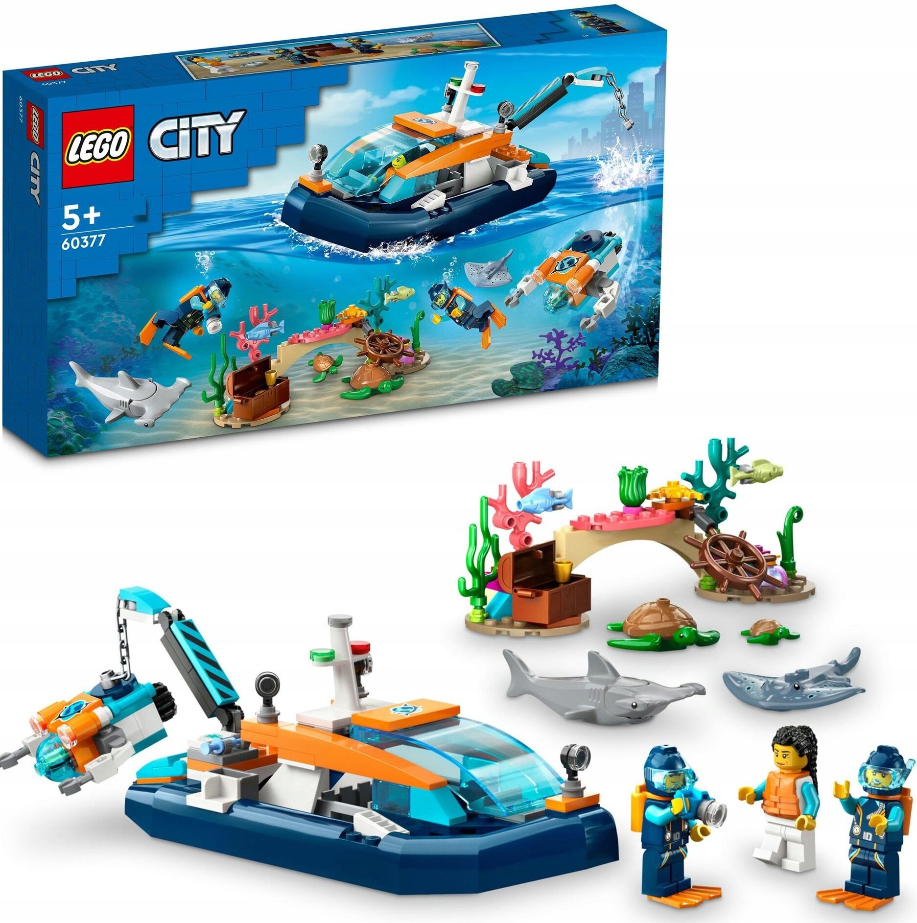 Этот город Lego® City lłódź для исследования дайвинга ждет бесконечных приключений. Плавающая игрушечная лодка имеет много реалистичных функций, в том числе работающий кран. Комплект также включает в себя небольшую подводную лодку, пейзаж кораллового рифа и сундук с сокровищами. также есть три мини -исследователи в наборе, а также наклейка, акула молота, краб, две рыбы и две статуэтки черепах, а также множество вдохновляющих аксессуаров