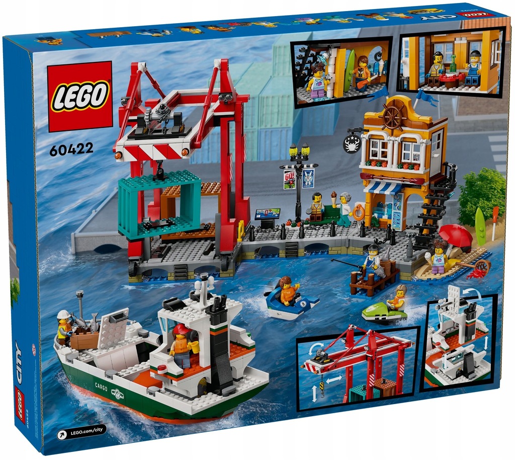 Дети могут использовать кран, чтобы поднимать контейнеры с корабля LEGO и исследовать туристические места в порту с магазином, рестораном морепродуктов и пляжем. В набор также входят небольшая лодка и водный мотоцикл, а также восемь минифигурок для ролевых игр и создания историй.