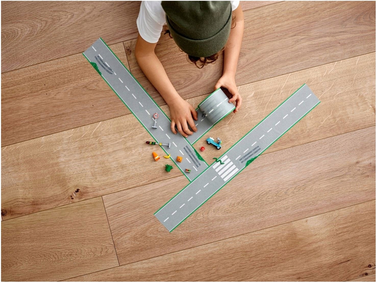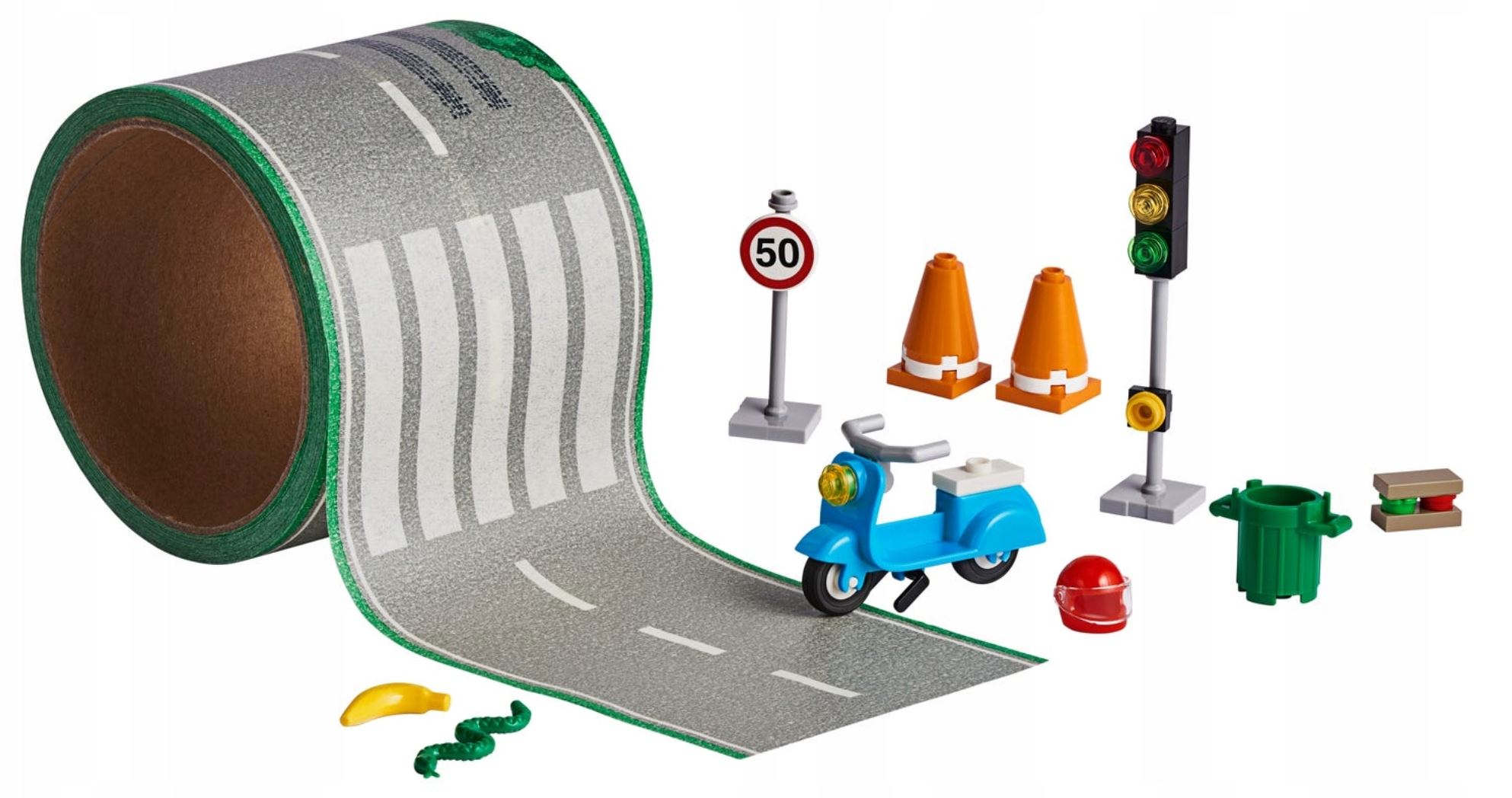 Поклонникам LEGO® понравится устраивать захватывающие гонки с помощью набора аксессуаров Tape Road (854048). Размотав серую ленту с дорожными полосами, следами шин и участками газона, дети смогут разыграть интересные истории, используя восемь аксессуаров, таких как знак ограничения скорости, дорожные конусы, уличные фонари и самокат. Набор можно комбинировать с другими моделями LEGO®, чтобы дети могли гонять на своих машинках по конвейерной ленте.