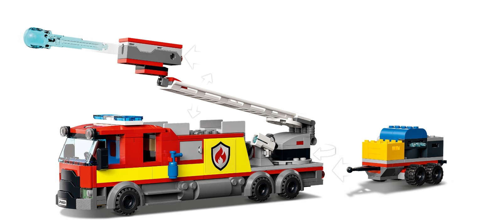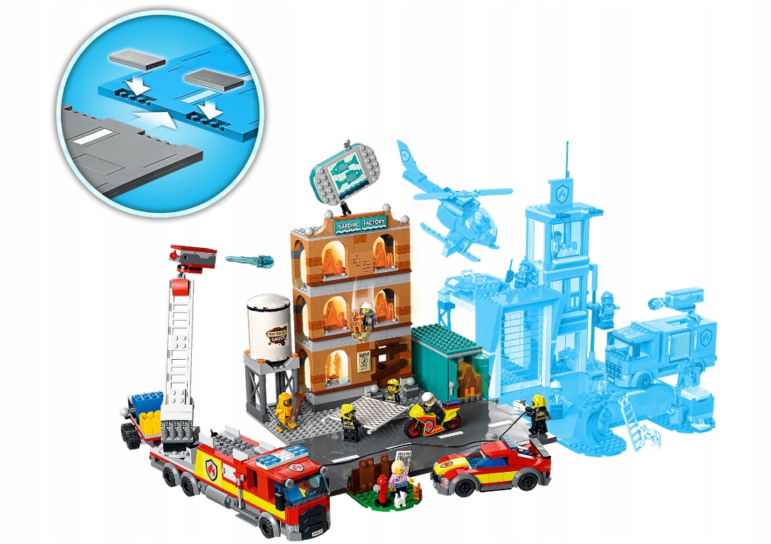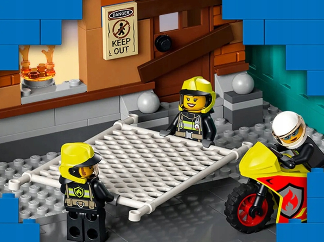 ✅ Включает двухэтажная фабрика по производству сардин со складным пламенем LEGO и баком с «секретным соусом», пожарная машина с прицепом, стреляющим «водяными» кирпичами, пожарный мотоцикл и пикап командира пожарной части.