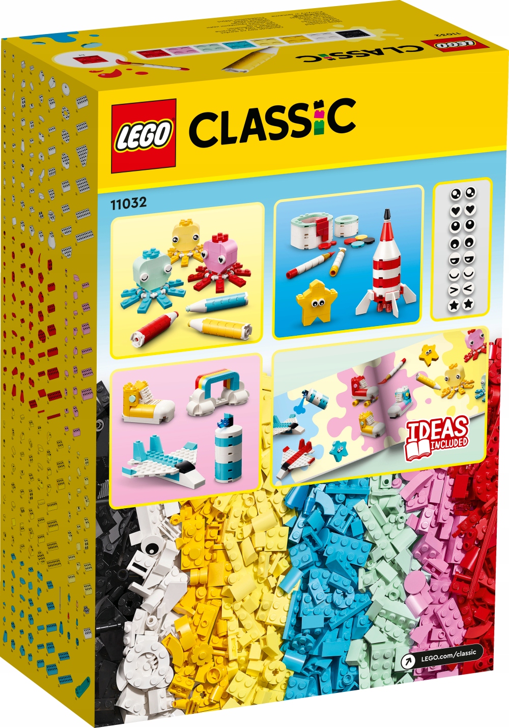 - Дети продолжают творить: набор LEGO® Classic Creative Color Play (11032) с огромным выбором разноцветных кубиков и множеством аксессуаров предлагает множество возможностей для творческих игр для детей от пяти лет и старше.
