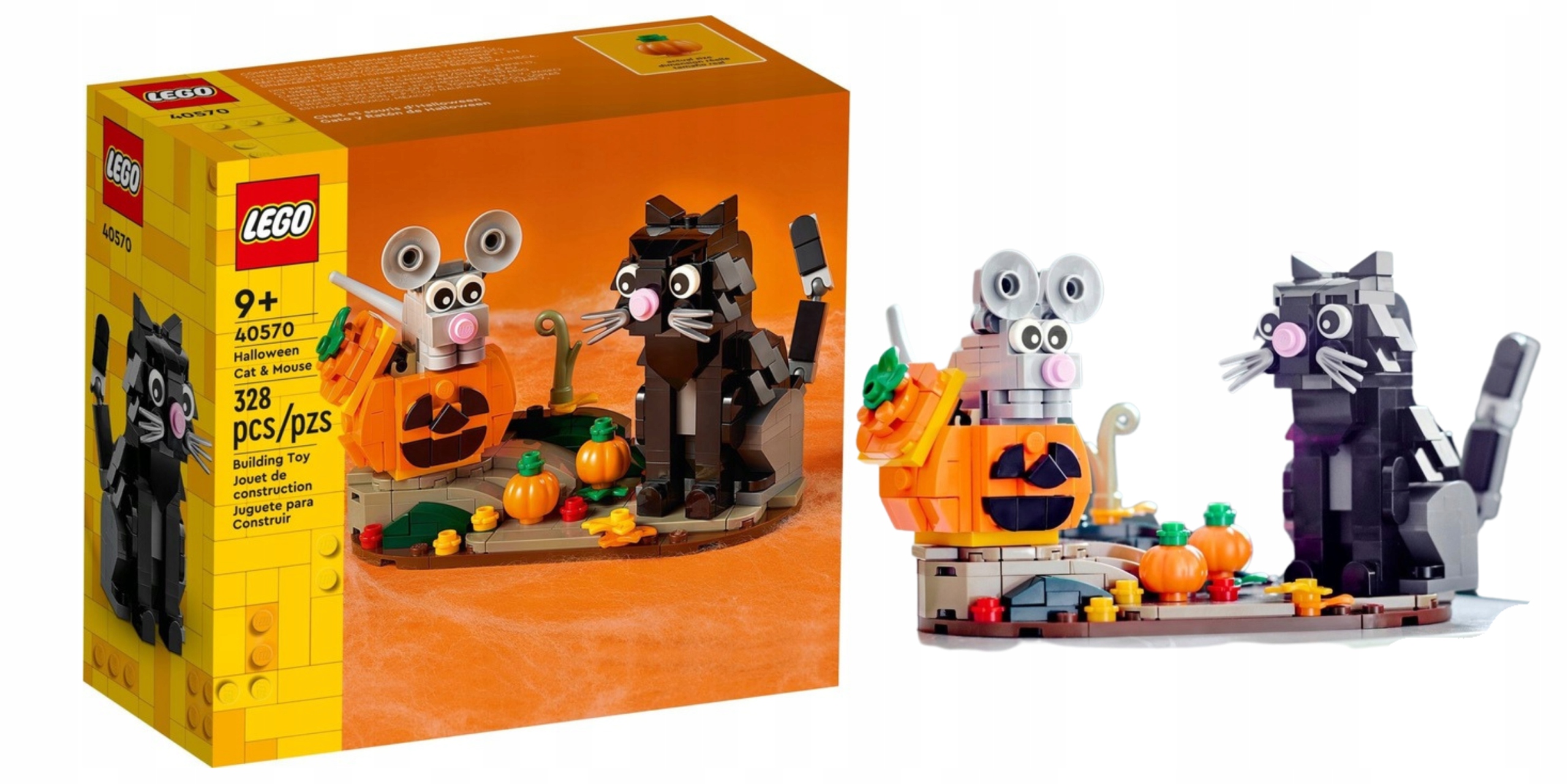 Lego Seasonal Cat and Mouse Halloween 40570. Набор LEGO® «Кот и мышь для Хэллоуина» (40570) позволяет вам собрать замечательное сезонное украшение. Милый котик играет с мышкой в прятки — грызун нашел идеальное укрытие внутри большой тыквы. Обратите внимание на миниатюрные тыквы и яркие осенние цветы, украшающие вращающуюся подставку. Этот набор станет отличным украшением на Хэллоуин. Это также станет отличным подарком на Хэллоуин для детей от девяти лет и старше.