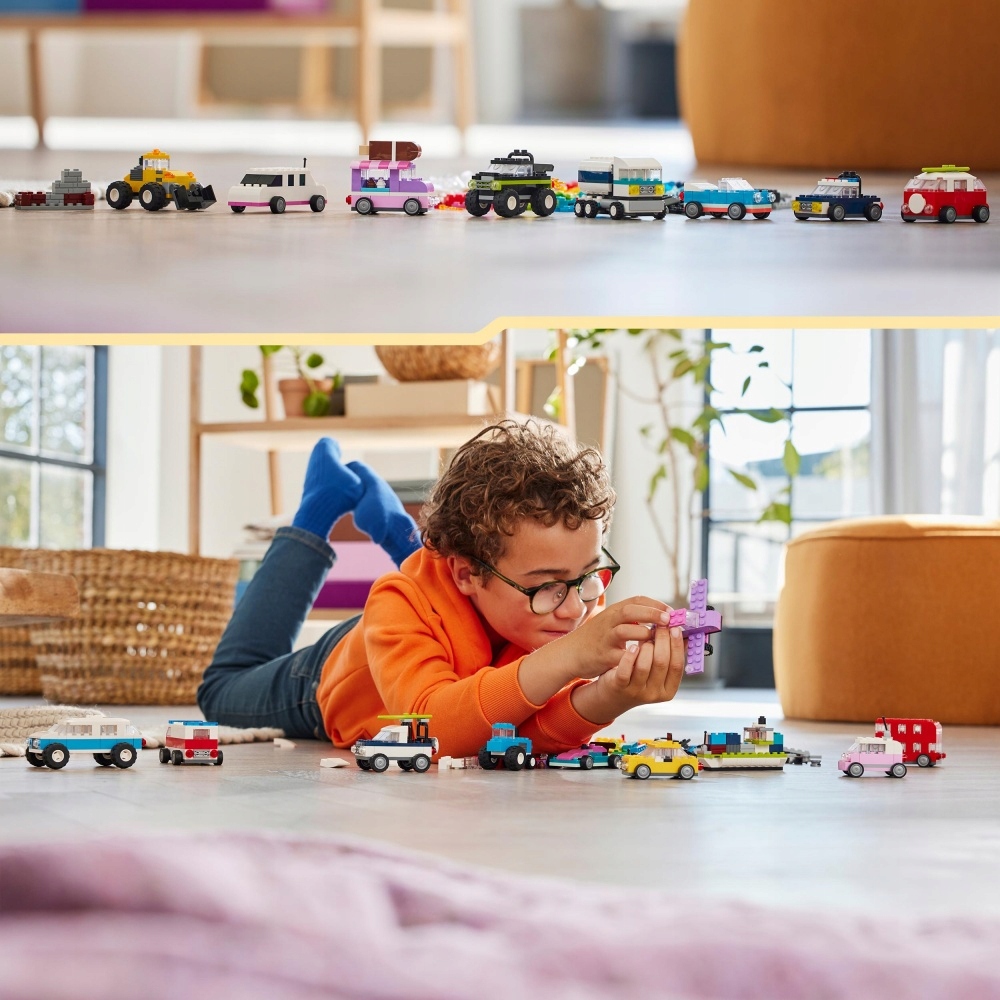 С помощью 900 кубиков, специальных элементов, 52 колес и простых инструкций дети смогут собрать игрушку. полицейская машина, фургон с мороженым, квадроцикл, экскаватор, грузовик, универсал, родстер и лимузин. Затем, используя идеи различных дизайнов, интересные детали и красочные украшения, дети смогут восстановить свои автомобили. По мере развития творческих навыков дети смогут придумывать свои собственные конструкции. В набор входят вдохновение и 10 идей, благодаря которым самые маленькие смогут сразу начать играть. Инструкции также включены в приложение LEGO Builder, которое позволяет детям масштабировать, вращать модели и отслеживать их прогресс.