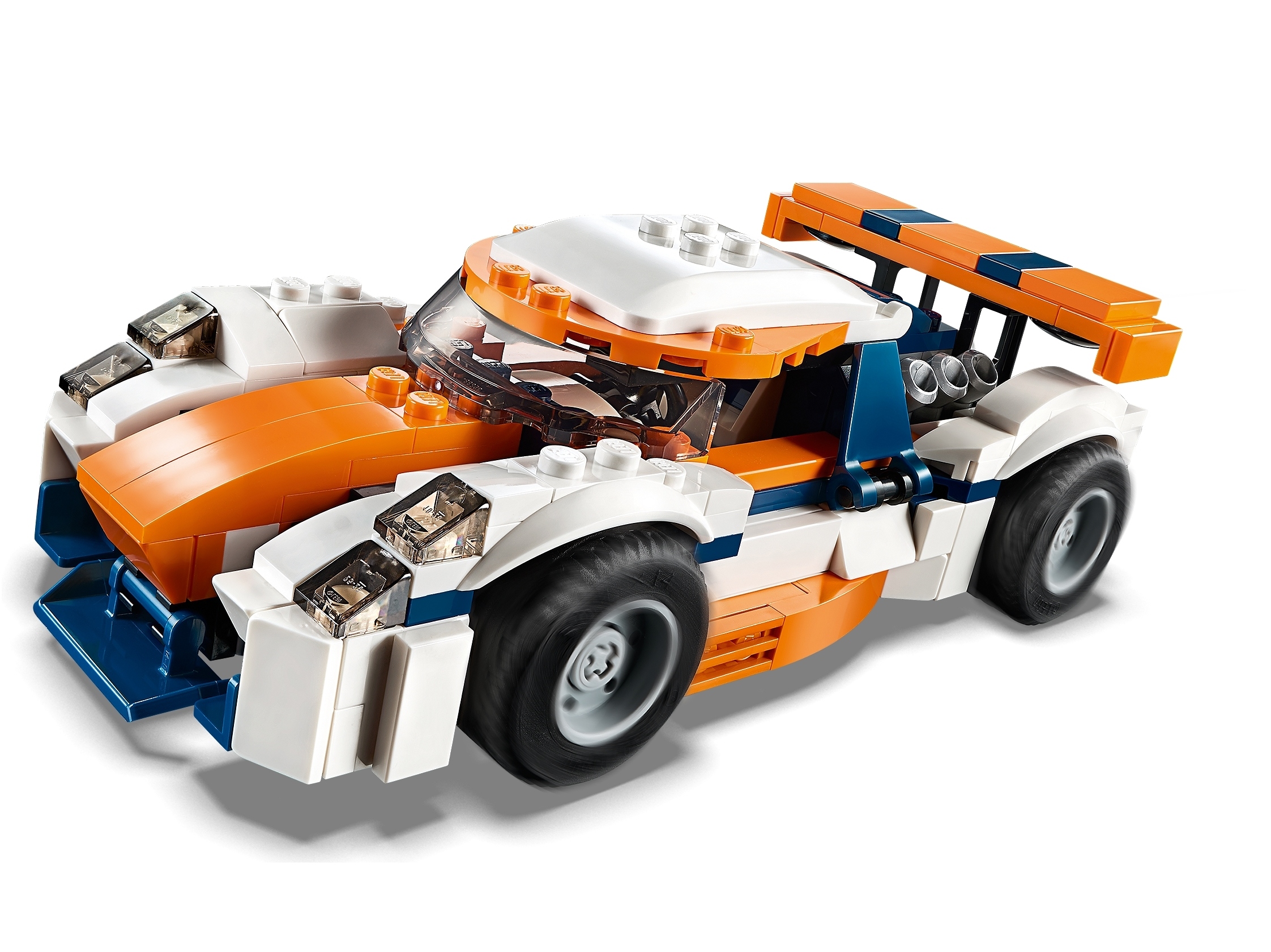 set, выиграйте гонку в Lego Creator 3 в 1 в 1 31089 Sunny Racing Core. Модель изготовлена из светло -оранжевых, белых и темно -синих блоков и имеет обтекательную конструкцию с большими воздушными приемами, вдохновленными настоящими спортивными автомобилями. Он также оснащен округлым, тонированным ветровым стеклом, тонированными передними лампами, видимым двигателем и большим спойлером сзади и клейких шин. Крыша может быть поднята, чтобы добраться до кабины, а конструкция с поперечной осью обеспечивает низкое трение. Lego Creator 3 в 1 набор позволяет создавать три различных моделя игровых моделей. Создайте солнечные гонки, а затем перестроните его в классический кабриолет Racing или моторную лодку, чтобы испытать еще больше приключений.